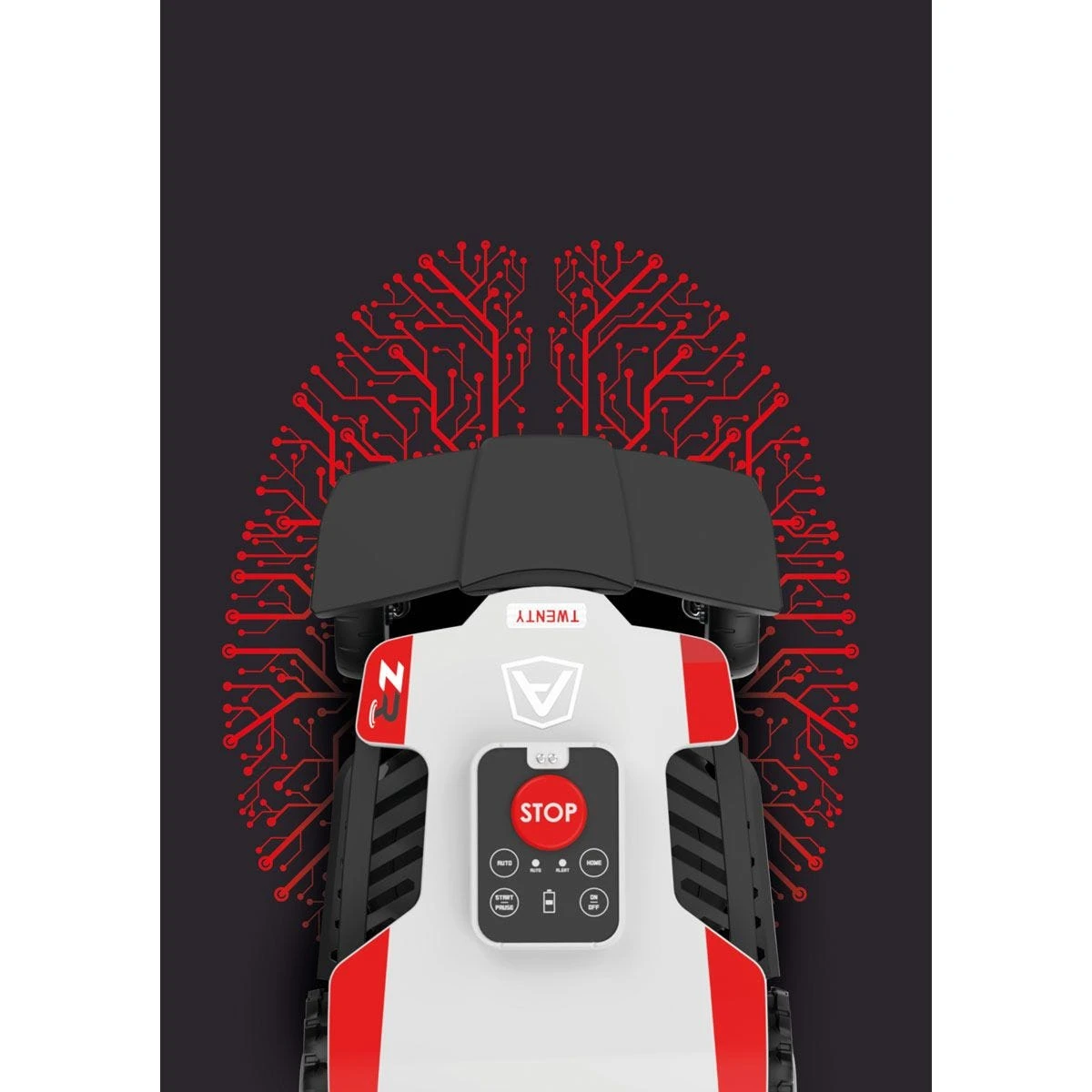 Twenty ZR is AmbrogioÂ’s compact, light, powerful and fast automatic robot mower, which does not require the installation of a perimeter wire. The robot is equipped with the most innovative technologies, which allow it to manage and map the garden by learning its characteristics. ZR technology integrates artificial intelligence systems with front mounted radar sensors, allowing the robot to detect grass, recognise obstacles at a distance (stationary and moving), edges and perimeters. Once itÂ’s finished a mowing session the Twenty ZR automatically returns back to the dock to recharge ready for the next scheduled mowing operation.
