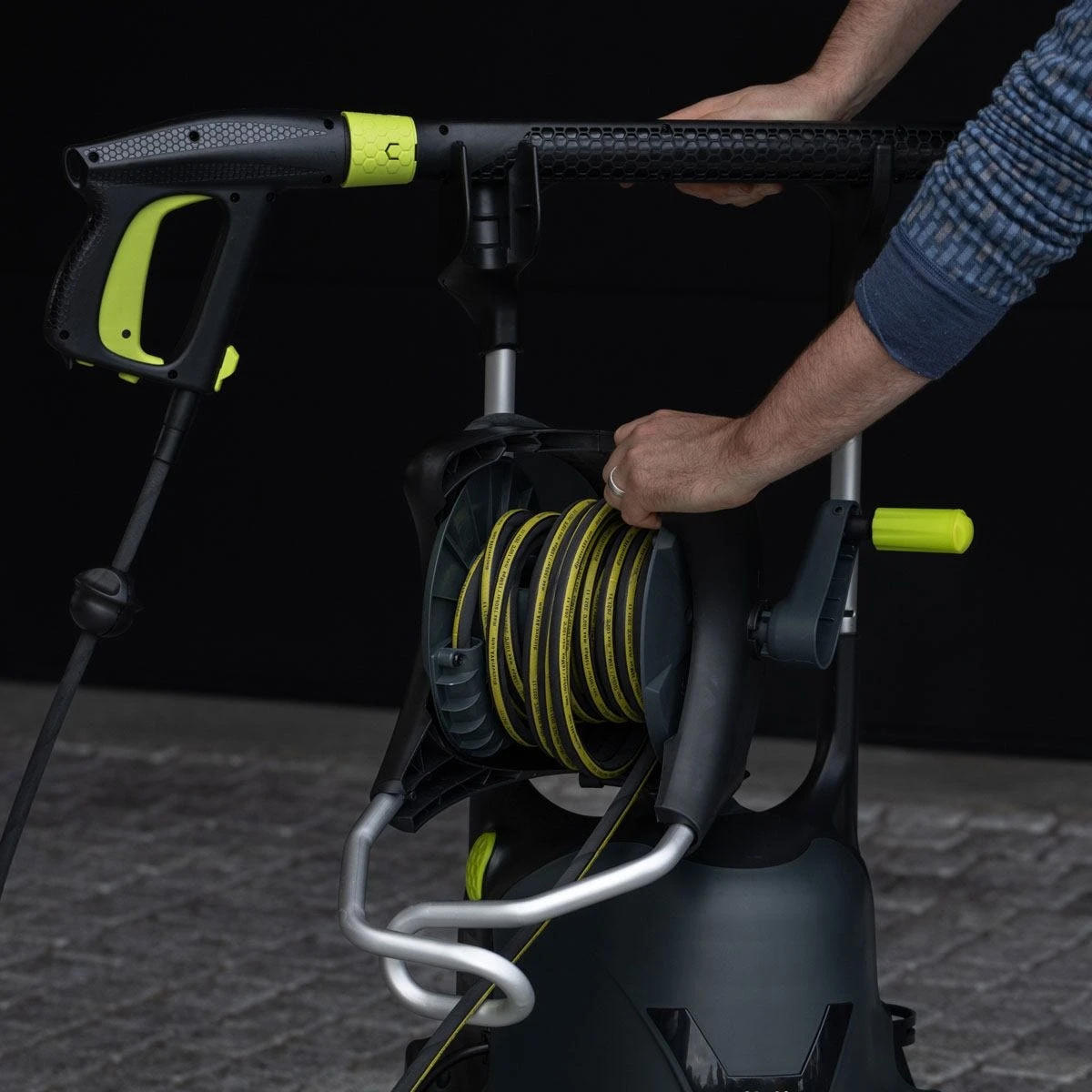 The Master series is designed with a focus on user-friendliness. This machine has a long-lasting 4-cylinder metal pump for durability and performance. It is extremely stable due to extendable front support, low center of gravity, and our “follow me” hose reel. The P60 XL is a large pressure washer and therefore equipped with big, sturdy wheels and a handle on the back for carrying.