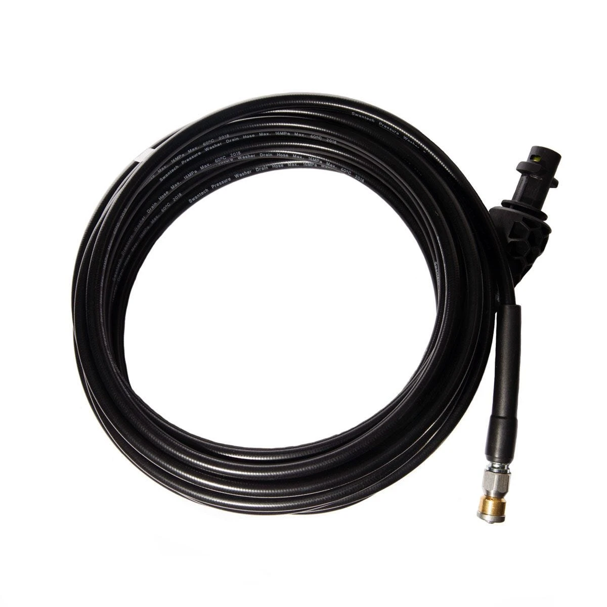 The hose is designed to open clogged pipes and to remove debris from drain pipes. The three-point rotation nozzle has high efficiency and pulls the hose through the pipe and cleans the walls at the same time. The tubing is made of a rigid fiber-reinforced type that enables the user to push the rotating nozzle hole bends through narrow passages in the piping system. The nozzle pulls the hose inwards and cleans 10 times as effectively as normal pipe nozzles.