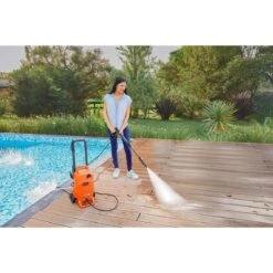 Black+Decker BEPW1700 is a lightweight self-priming pressure washer with a powerful 1700w motor providing 125 Bar/1810PSI of water pressure. With eight accessories, wheels, and a long handle.