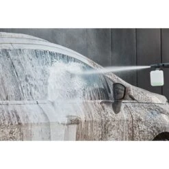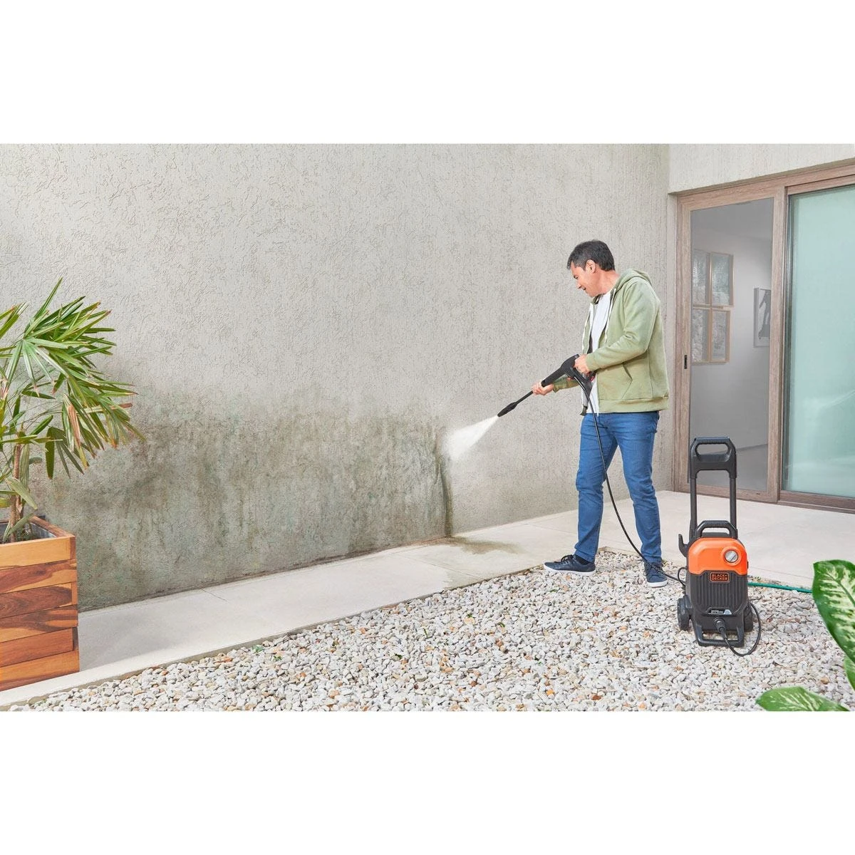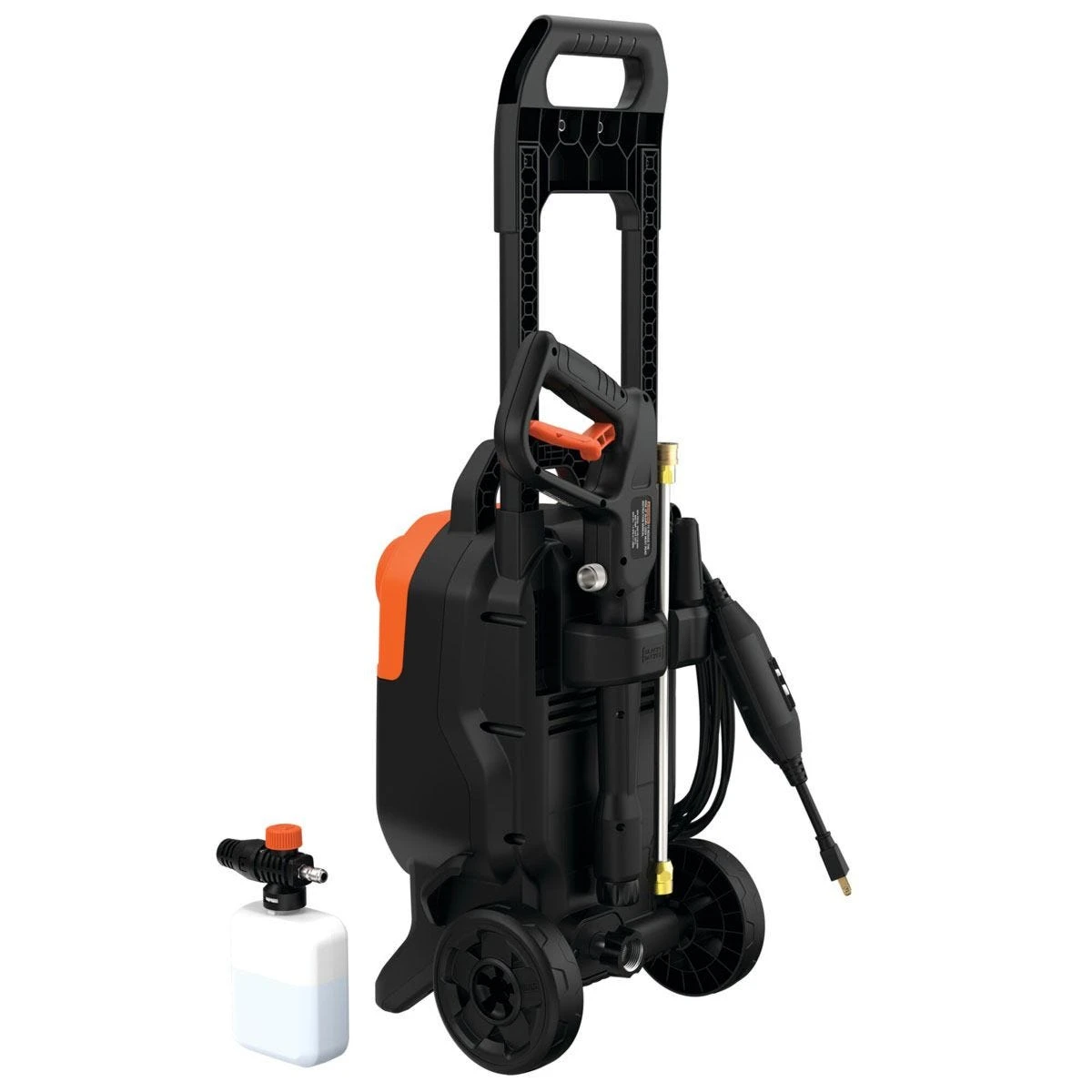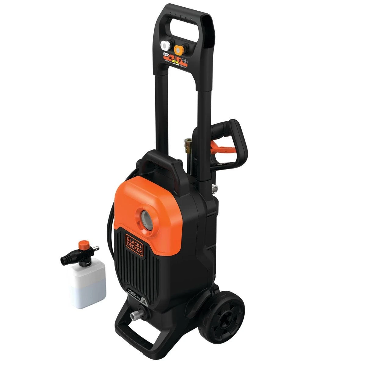 Black+Decker BEPW2000 is a lightweight self-priming pressure washer with a powerful 2000w motor providing 150 Bar/2175PSI of water pressure. With nine accessories, wheels, and an adjustable handle.