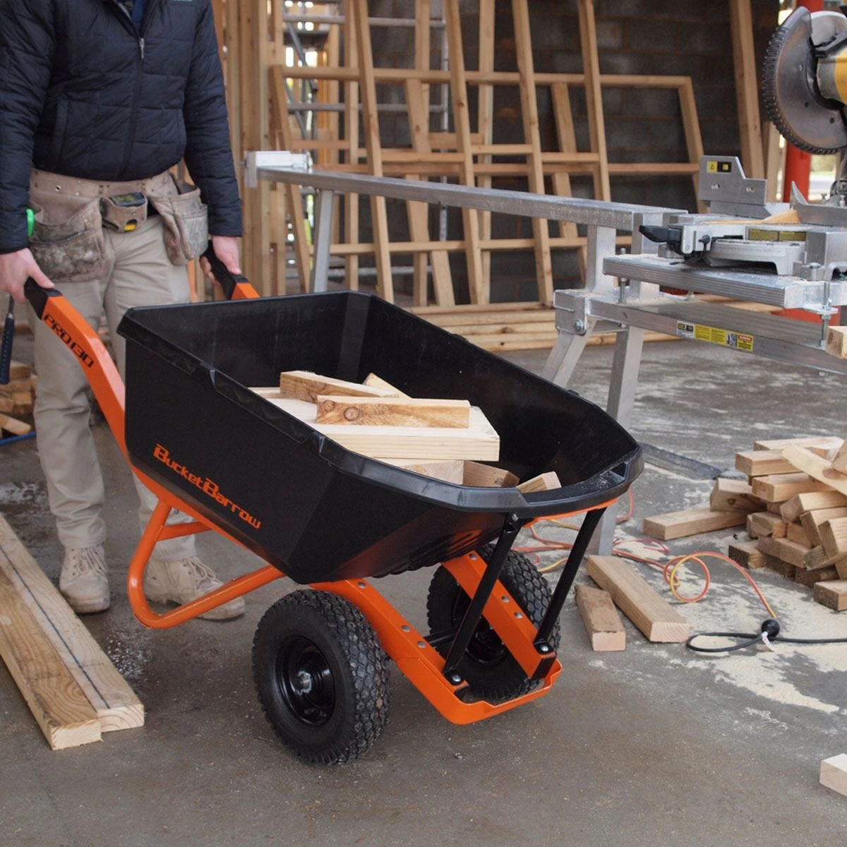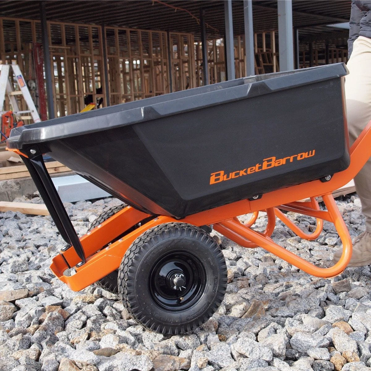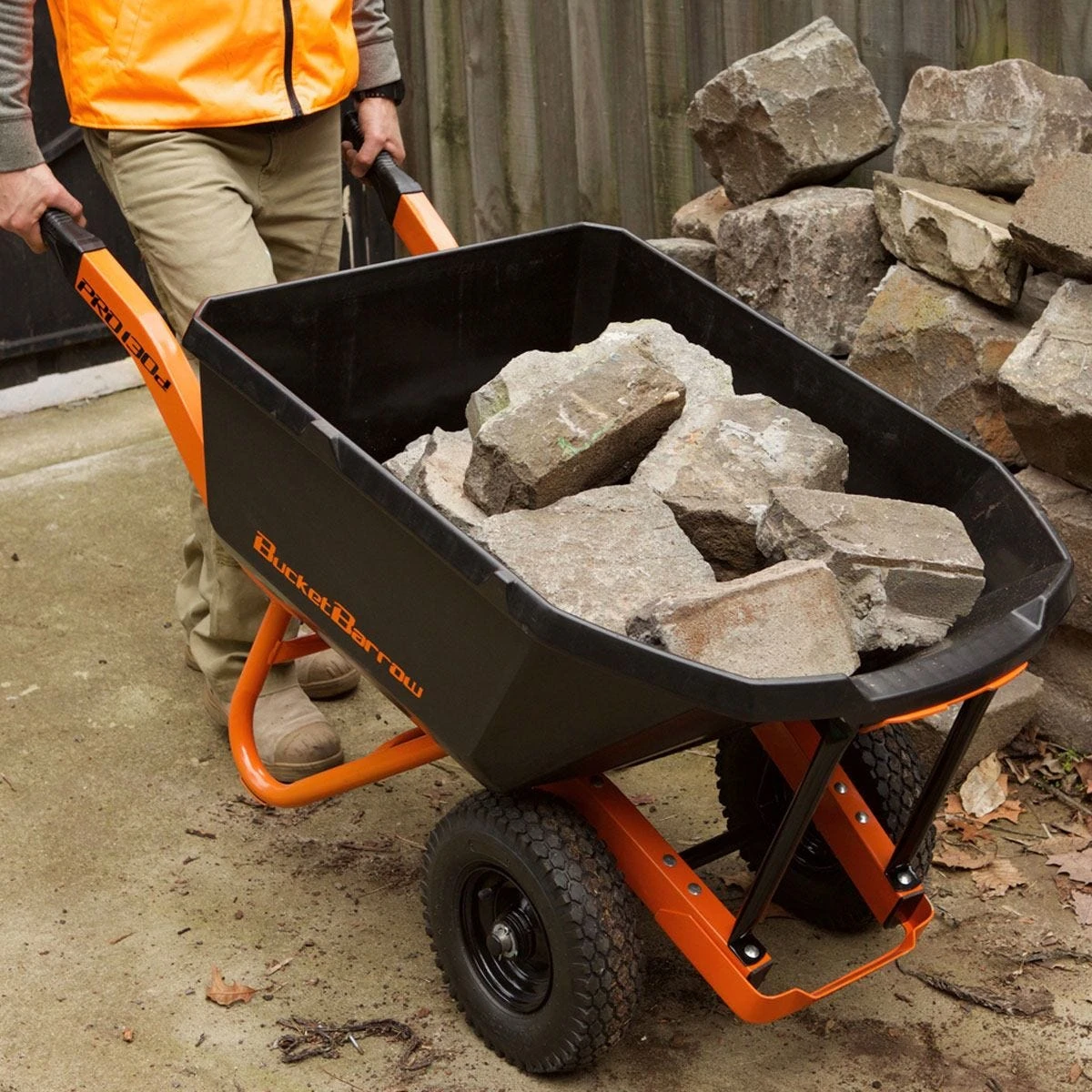 Heavy, large loads are mastered Safer, Easier and Faster with the PRO130d BucketBarrow Wheelbarrow. The PRO130d BucketBarrow is a trade tough wheelbarrow designed for optimal material loading, unloading, movement and placement in heavy duty work environments. Designed specifically for site work, this barrow was designed buy builders, for the trade. But donÂ’t let that put you off, the stable twin wheel design and large capacity makes it great for use in larger gardens at an allotment or even for mucking out the stables.