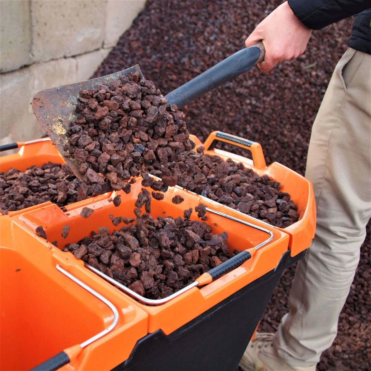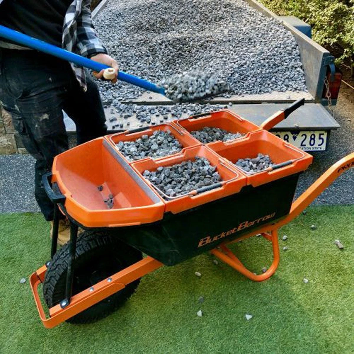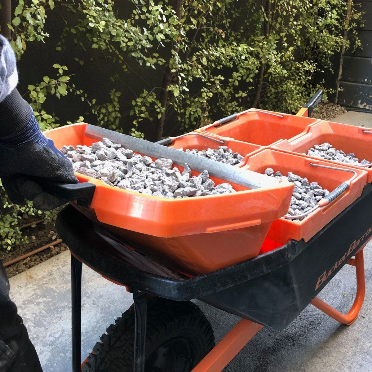 - With the buckets you can keep materials separated. With tapered edges, you can fill them all up at once in the barrow before splitting the load later