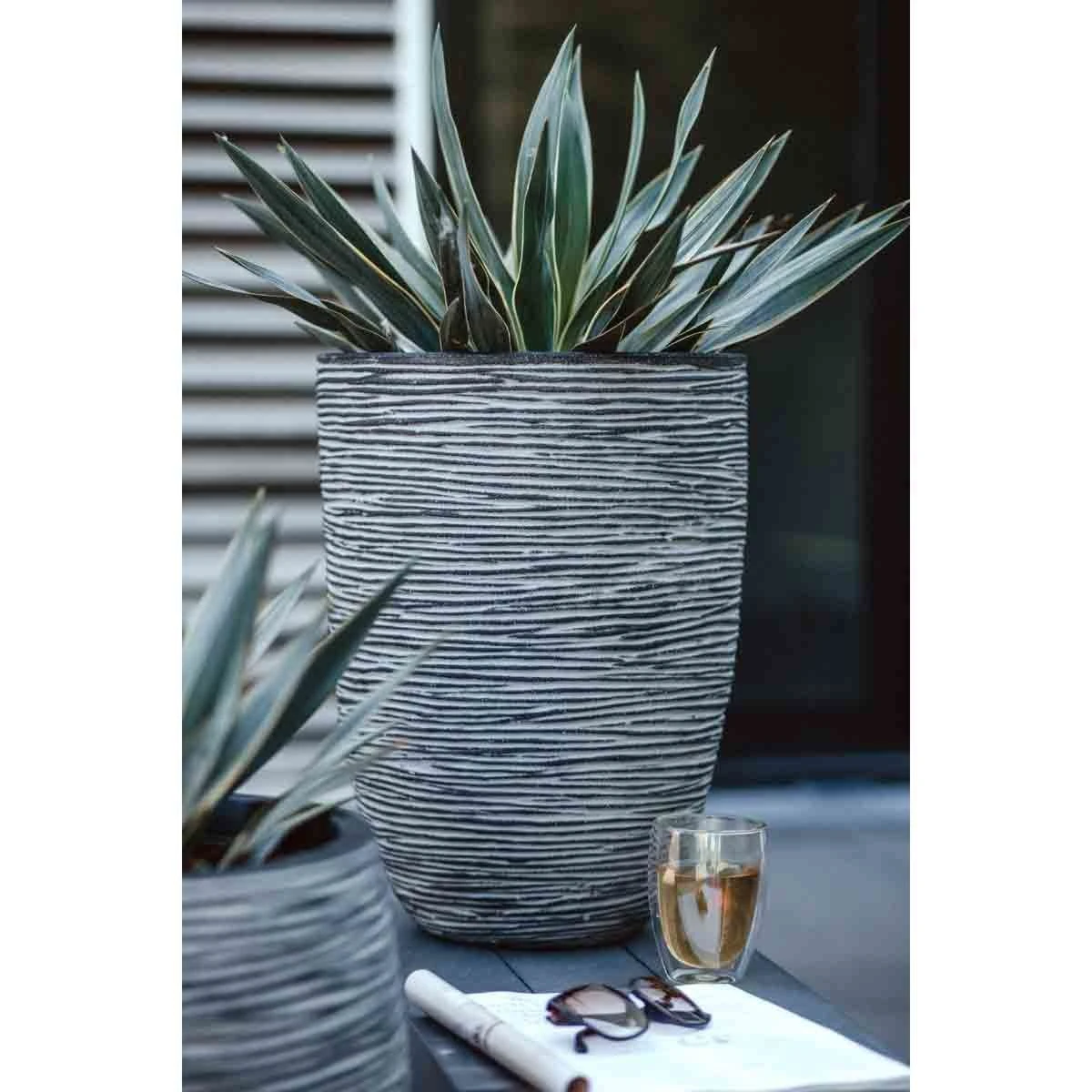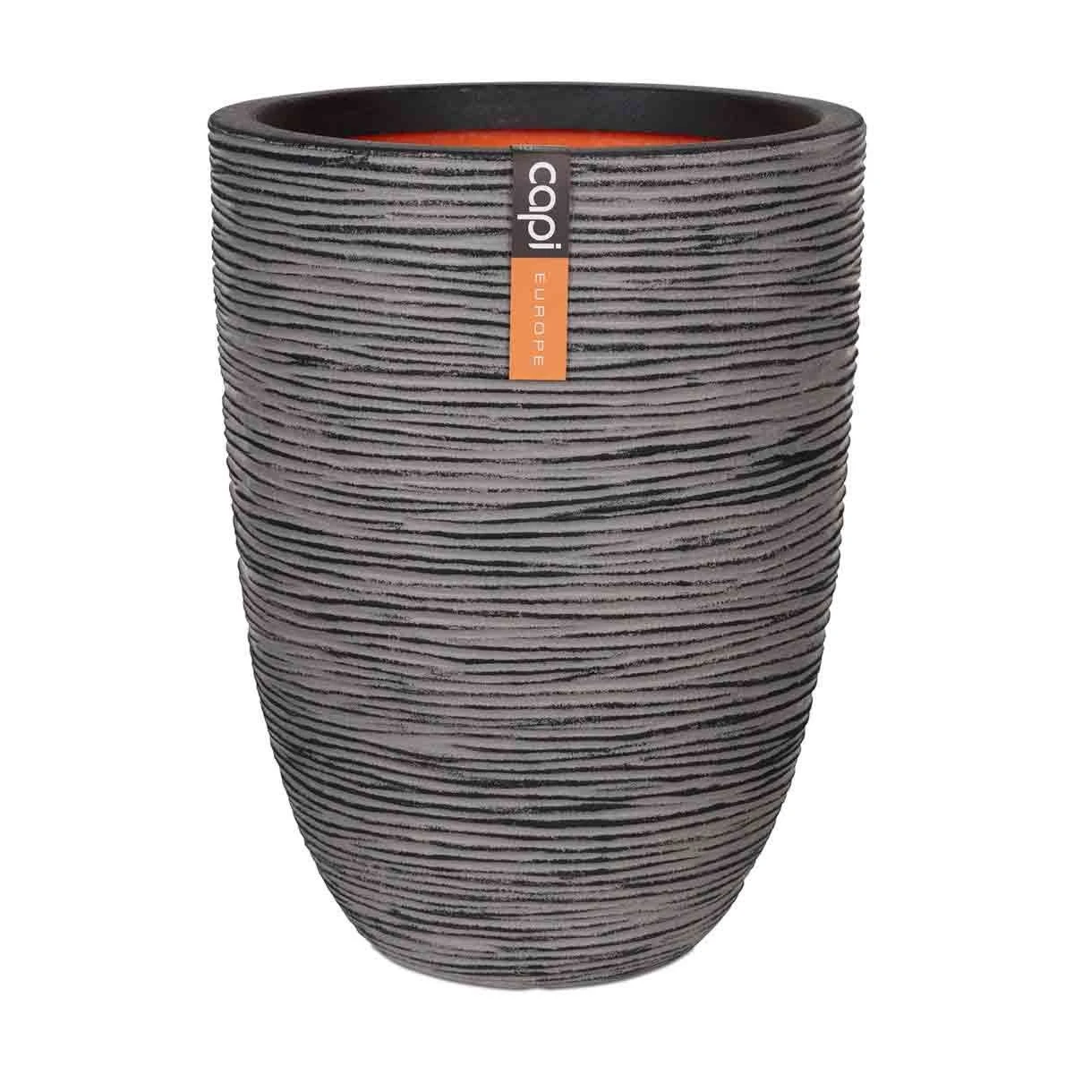 This sustainable planter out of the Rib collection is made with recycled materials and is suitable for indoor and outdoor use. The orange inside of the planter is intended to represent their place of origin and it also provides the planters with insulation, offering your plants extra protection against both heat in summer and cold in winter. This extra layer provides extra firmness to the planter, which makes it fracture-resistant. In addition, the flower pot has a lifetime guarantee.The Rib-texture gives the planter a natural look. The RibÂ’s texture is inspired by wickerwork with its elegant lines. Besides the natural look, the small, dancing lines provide a playful touch to these Capi pots. The Nature Rib NL is available in the colours black, ivory, anthracite and dark brown. The different colours give each flower pot its own character. The planter is perfect for indoor use, because the planters are 100% watertight. For outdoor use you only have to drill a drainage hole with a minimum of 25 mm.