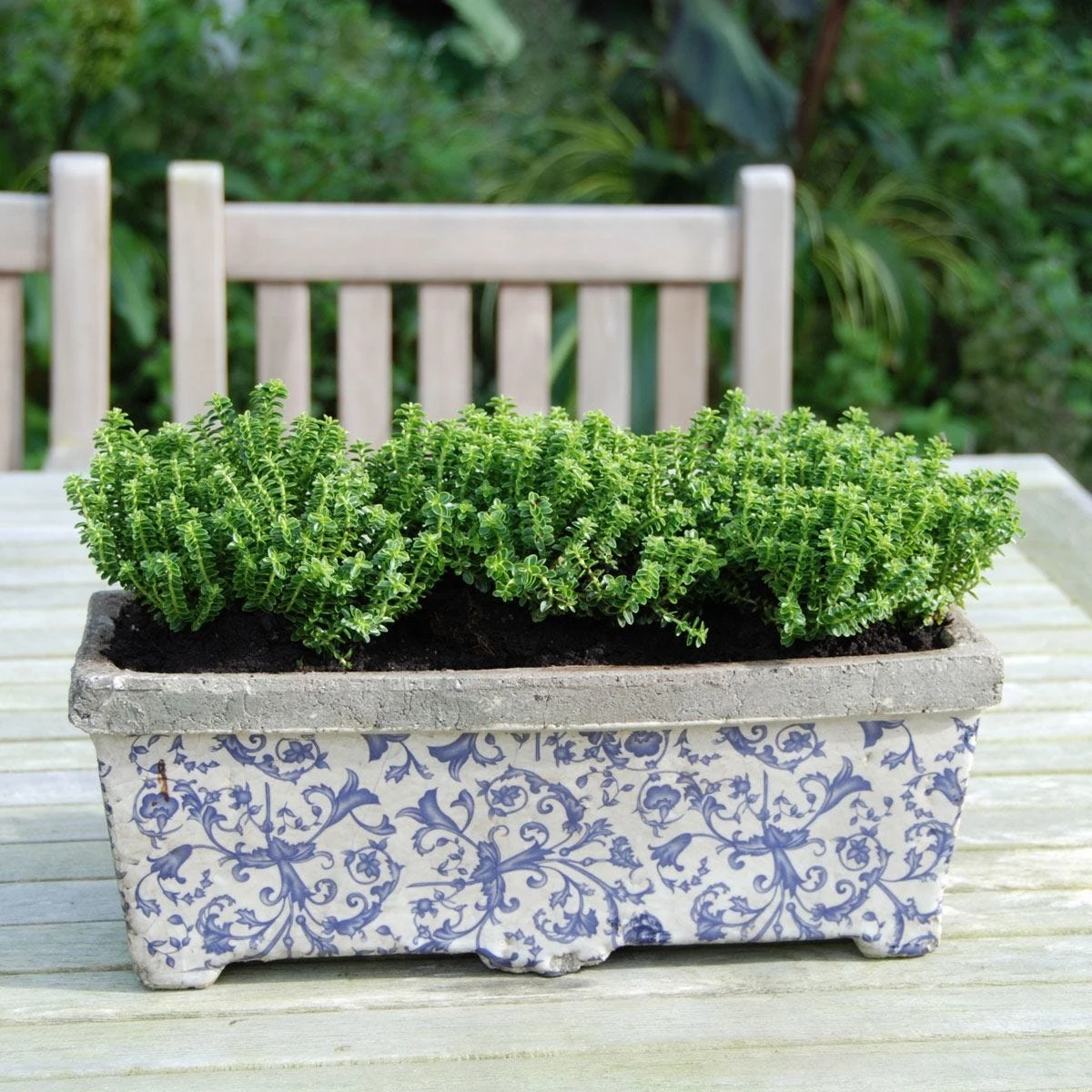 This balcony planter with elegant blue and white print creates a lot of atmosphere in the garden or on the balcony.