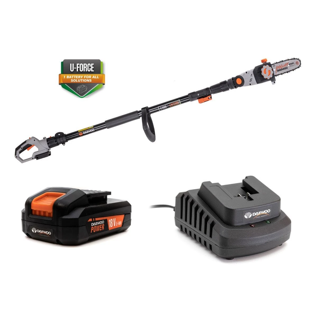 The cordless pole chainsaw is a battery-operated device, part of DAEWOO’s U-Force interchangeable battery family, One battery for all system.