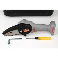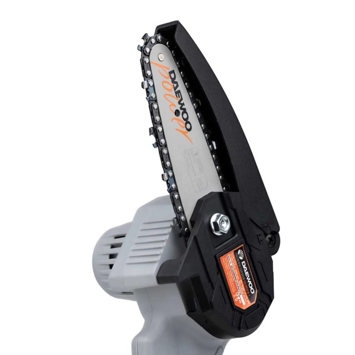 The handheld mini chainsaw is a battery operated device, part of DAEWOO’s U-Force interchangeable battery family, One battery for all system.