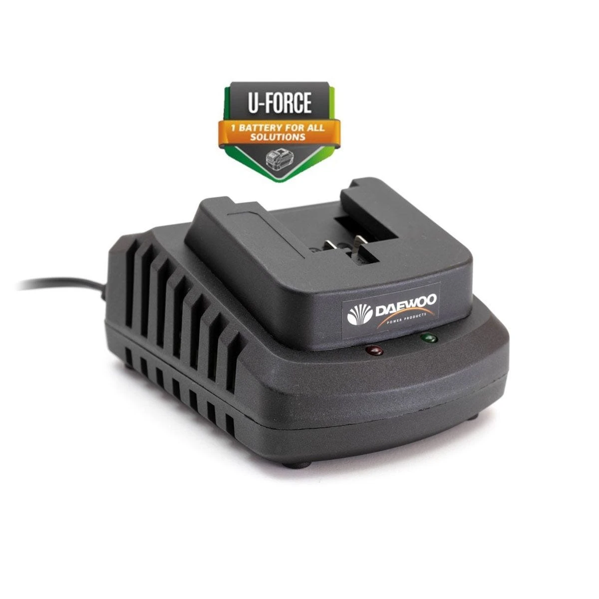 The charger is equipped with overload protection. LED light indicators give real-time charging status information. Suitable for DAEWOO 2000 mAh, 3000 mAh and 4000 mAh DAEWOO U-FORCE series batteries. One charger for all your powertool batteries.