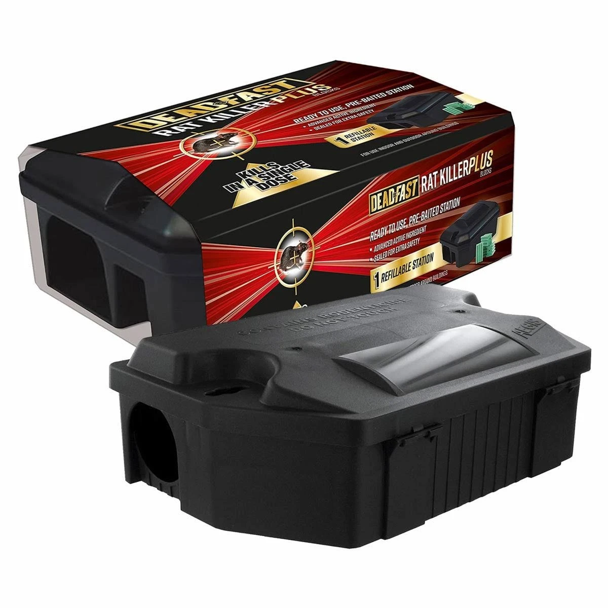 Deadfast Rat Killer Plus Blocks (pre-baited station) is a tamper resistant station containing five rodenticide blocks. The box secures the bait providing protection for children, pets and non-target animals. The sturdy bait box is weather proof, re-usable and contains a fixing plate for maximum security.