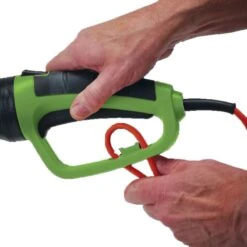 This lightweight hedge trimmer is equipped with high-quality 510mm long double-action blades. The robust 550W motor, metal gears and mechanical syncro help enhance the cutting performance. There is a two-handed VDE approved trigger switch with hand guard and quick-stop electronic brake for safety. The front handle switch is large and easy-to-use alongside the rear ergonomic soft grip. The design incorporates strain-relief for the power cord and also a cable hook to help manage the power cord while trimming. The blade encompasses a hang hole for ease of storage. Supplied with a blade storage guard and fitted with 10m VDE approved cable and plug.