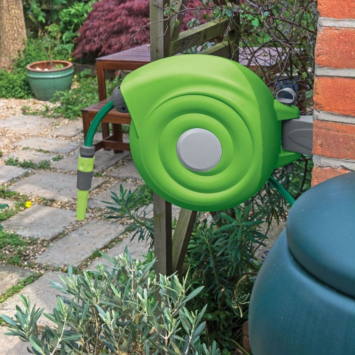 The Draper Retractable Garden Hose Reel is wall mountable and has a tough plastic case with rewind action fitted with an internal rewind guide helping prevent tangling.