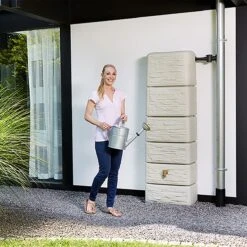 This contemporary 300L Slim Rainwater Wall Tank in Sand Beige is perfect for collecting a large amount of water in a small space and comes with a tap, an 3/4″ inner thread to fit in and accessories.