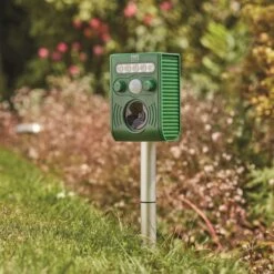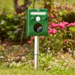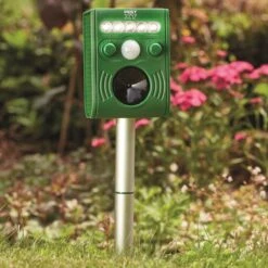 - Safe and effective; Uses a flash of light and ultrasonic sounds to scare away most garden pests