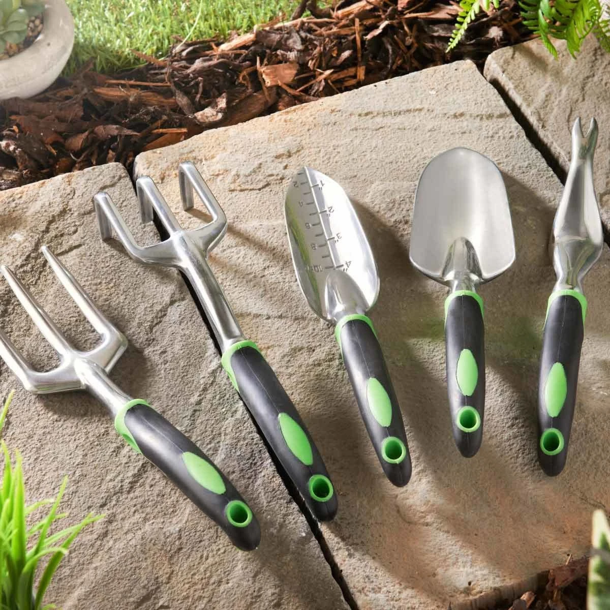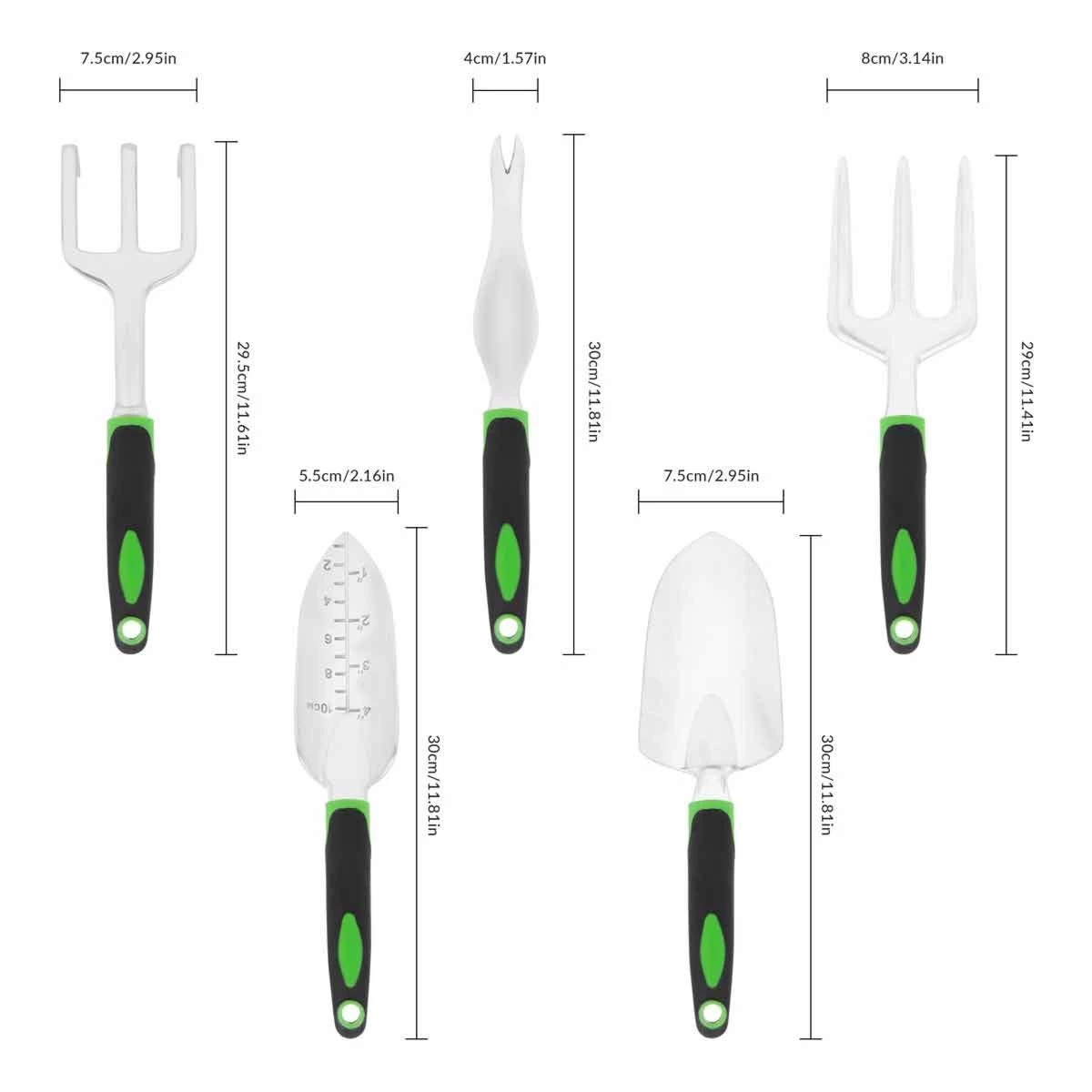 This 5 Piece Tool Set includes a planting trowel, a transplanter trowel, a handheld rake, a handheld fork, and a weed cutter, giving you all of the handheld essentials to take care of your gardenÂ’s plants and flowers! Each tool weigh less than 210 grams individually and measures around 30cm long, with widths between 4-8cm, making them convenient and easy to store and use.