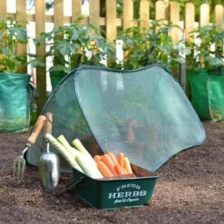 Get instant plant and crop protection with this pop up mini grow tunnel and veg bed cover. This triangular shaped plant cloche assembles in seconds – simply pop out the bag, pop up and peg down! The high-grade 4mm mesh netting protects against a variety of garden pests including birds, cabbage white butterflies, rodents and large insects. Letting light, air and moisture in, it also offers an optimised microclimate for healthy plants and edibles. Ideal for small grow beds and urban gardens, these beauties can also be popped on raised beds and planters for hassle-free protection for strawberries, salads, herbs and other crops. Comes with securing ground pegs and storage bag.