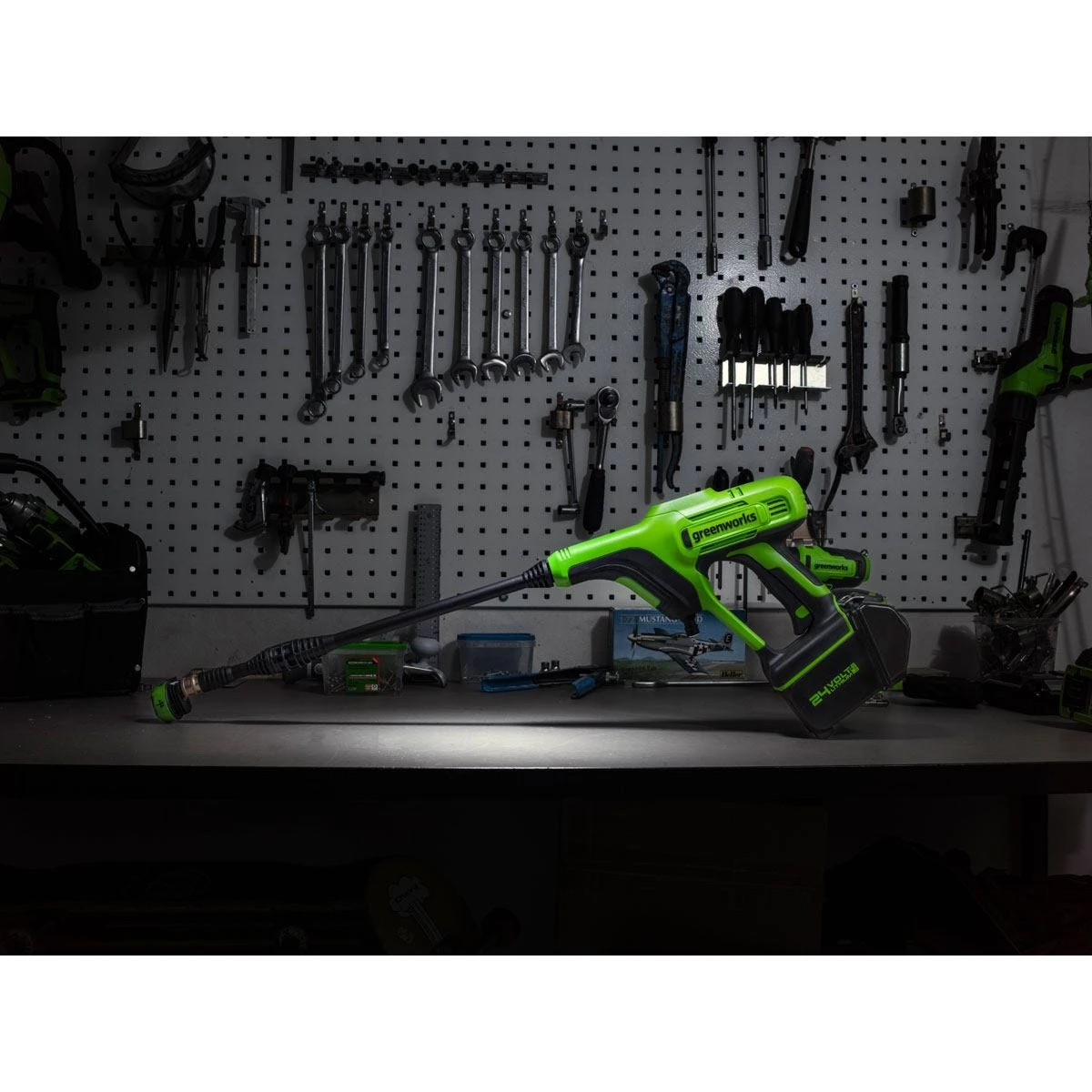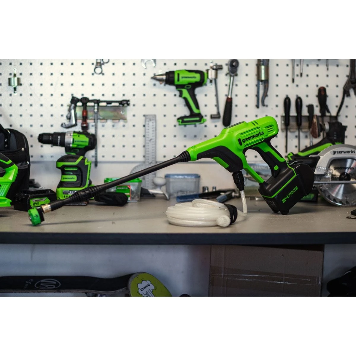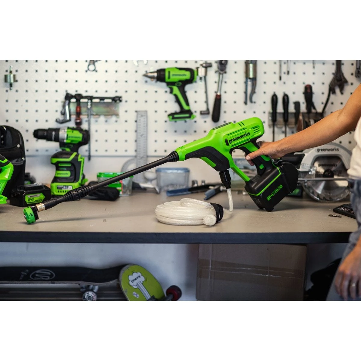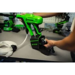 The Greenworks GWG24PWK4 24V 24 Bar Cordless Hand Held Pressure Washer is compact, lightweight, and easy-to-use. With 600 PSI at 0.8 GPM, there is plenty of power for cleaning windows, outdoor furniture, cars, boats, campers, and more. It features a versatile 5-in-1 nozzle for cleaning dirt and debris from a variety of surfaces and works with any typical garden hose.