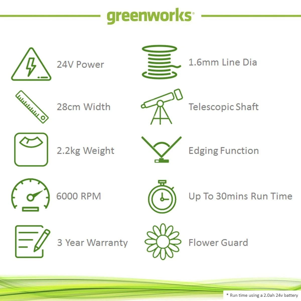 - Up to 30 mins run time (using a 4Ah 24v battery)