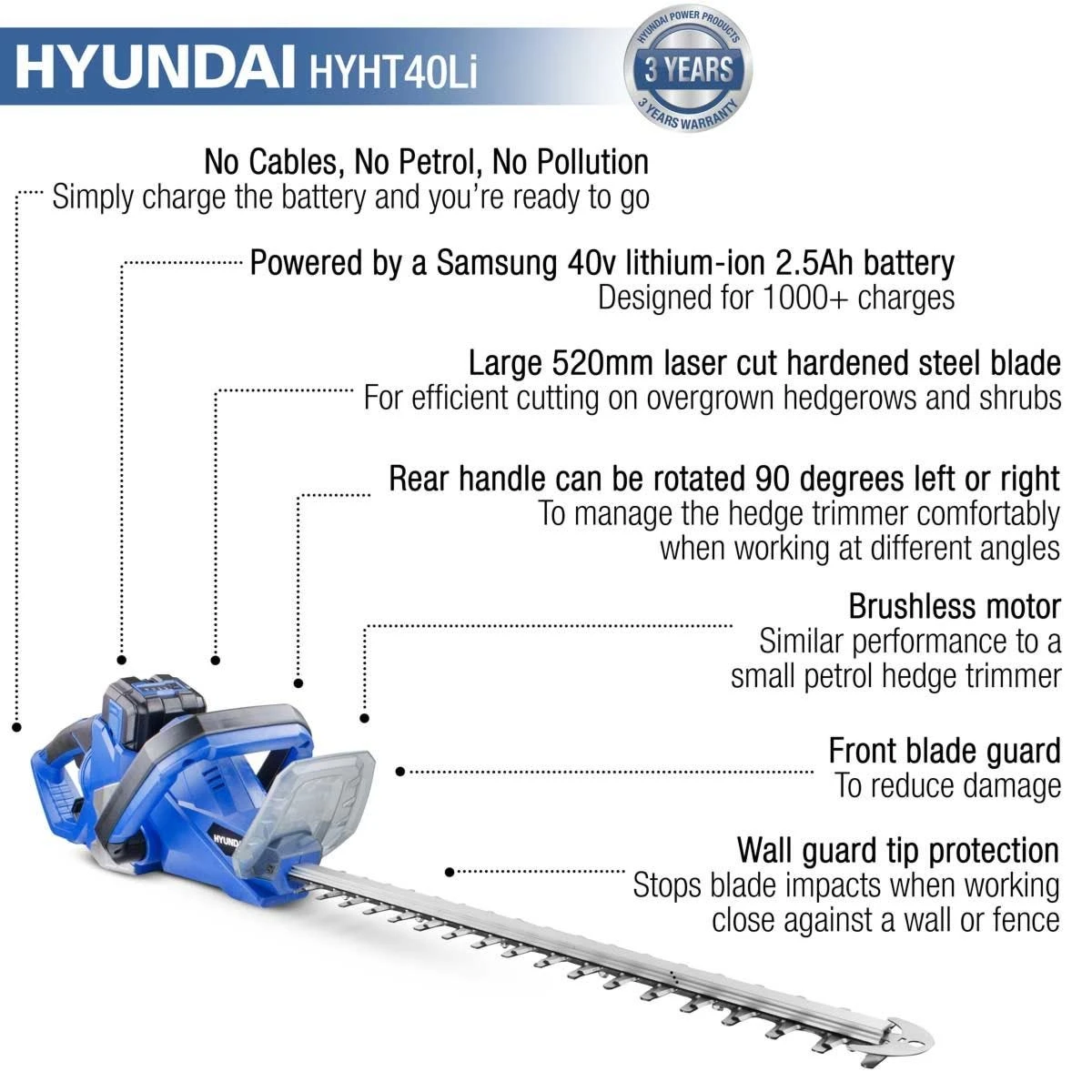 - Part of the Hyundai 40v cordless range – One battery powers the entire Hyundai 40v range, enabling you to buy blank units of additional machines and interchange the battery for a cost-effective collection of garden tools. The battery and charger are included with this unit.