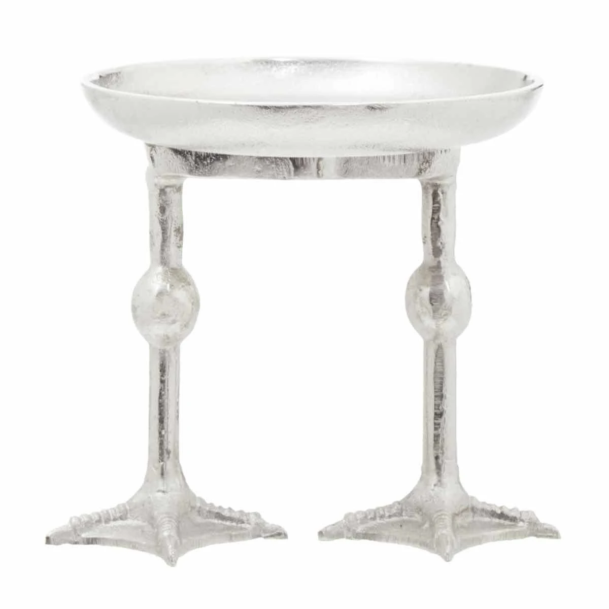 The Duck Feet small plant stand features an oblong round top in a reflective silver finish with hints of distressed effect. Playful and whimsical, this freestanding fixture will create plenty of humorous conversation.