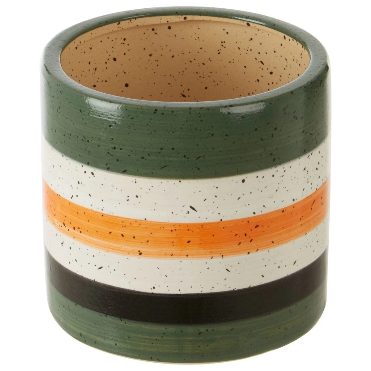 This planter is handcrafted, meaning that each individual piece boasts its own unique variations. The green, white and orange colour combination is vibrant, and a dash of black offers a contrast.