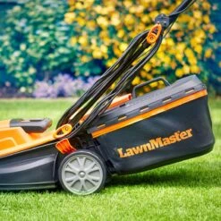 This powerful and compact LawnMaster 1400W electric rotary lawnmower with 34cm cutting width is perfect for use on small to medium sized lawns. The 1400W motor features T-Drive™, which automatically adjusts the blade speed to suit the grass conditions when mowing. An integrated rear roller helps you achieve a precise, professional striped finish on your lawn. A single lever changes the height of cut from 20mm up to 70mm. This mower is supplied with a 32L collapsible Redi-bag grass box which can be stored away neatly on top of the mower. Folding handles give a compact footprint, and a central carry handle makes it easy to move the mower in and out of tight spaces in the garage or shed. Generous 10m cable included. Buy with the confidence of knowing that your new mower comes with a two-year guarantee. Model No. MEB1434M