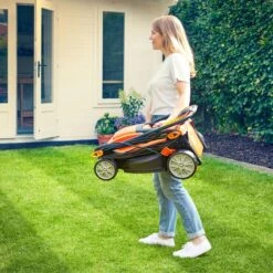 - Convenient central carry handle for moving the mower in and out of tight storage spaces, and transporting the mower over uneven surfaces and up and down steps