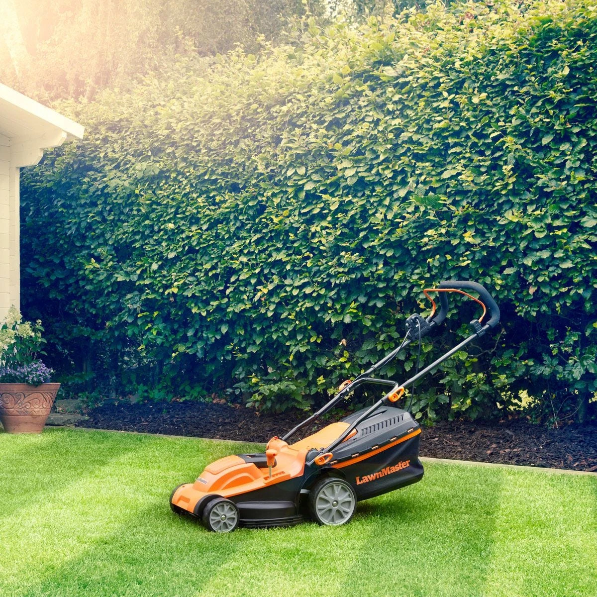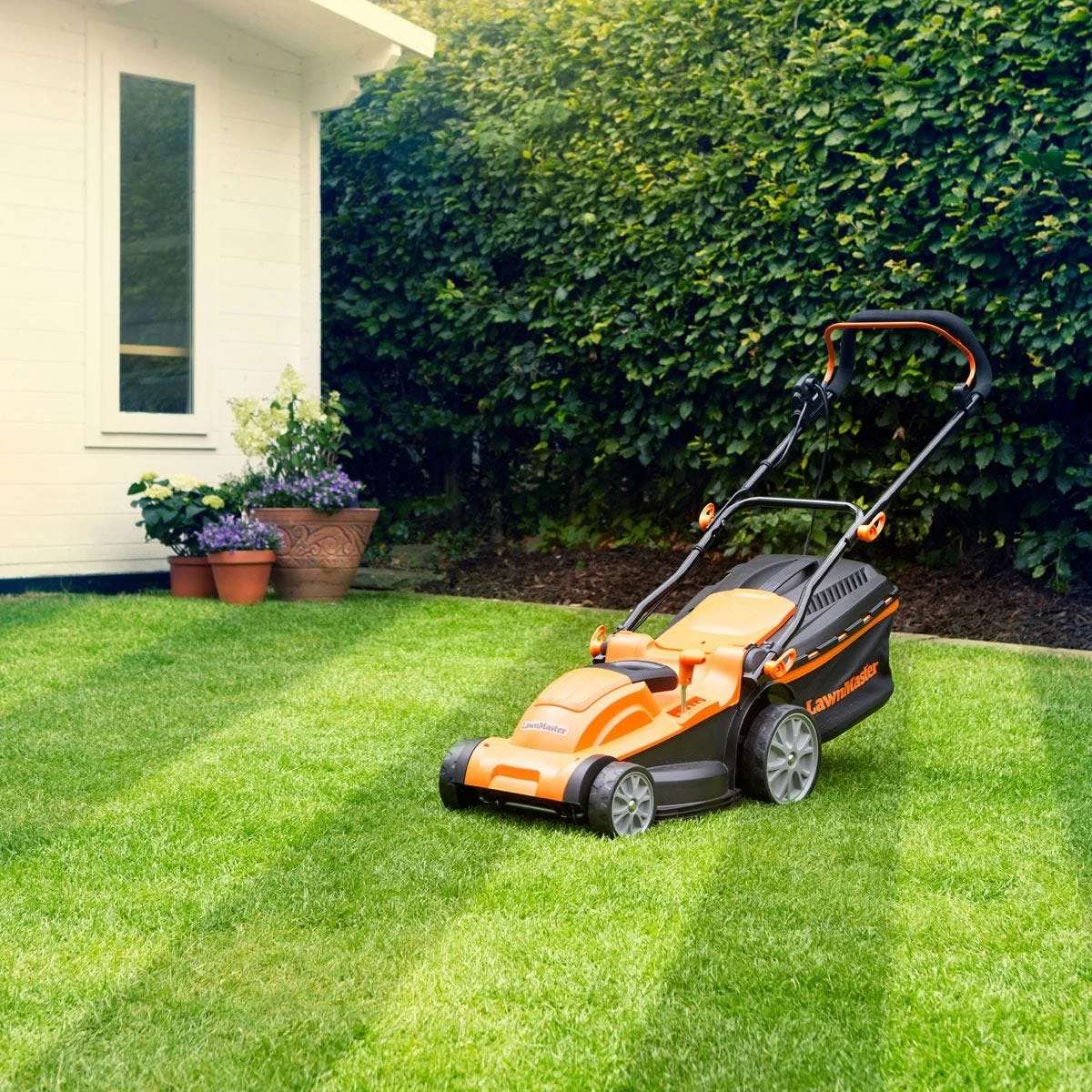 This powerful LawnMaster 1600W electric rotary lawnmower with 37cm cutting width is perfect for use on medium sized lawns. The 1600W motor features T-Drive , which automatically adjusts the blade speed to suit the grass conditions when mowing. An integrated rear roller helps you achieve a precise, professional striped finish on your lawn. The central lever changes the height of cut from 20mm up to 70mm. Use with the 40L Redi-bag grass collector or with the supplied mulch plug for the option to finely cut the grass clippings and return them to the lawn surface as a nutrient for the grass. Folding handles give a compact footprint, and a central carry handle makes it easy to move the mower in and out of tight spaces in the garage or shed. The collapsible Redi-bag stores neatly on top of the mower. Generous 10m cable included. Buy with the confidence of knowing that your new mower comes with a two-year guarantee. Model No. M2EB1637M-01