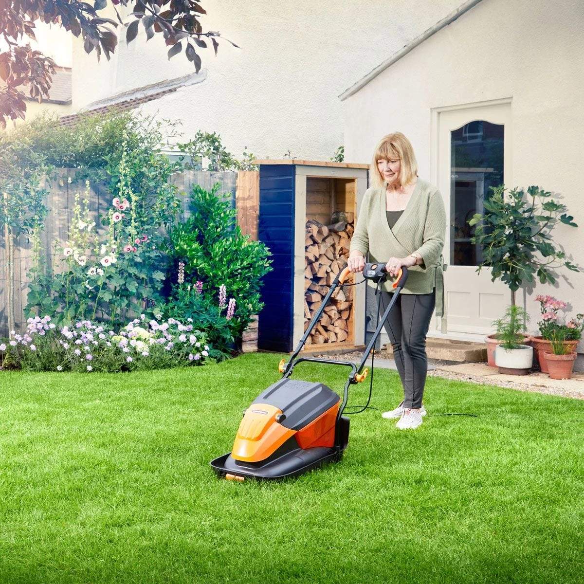 The LawnMaster 1500W electric hover lawn mower with grass collection box and 33cm cutting width is ideal for small to medium-sized gardens. The mower floats on a cushion of air, making it lightweight and easy to manoeuvre around curved lawns, sloping gardens and tight spaces. Although lightweight, this mower has plenty of power to tackle tough cutting conditions with T-Driveâ„¢, which automatically adjusts the blade speed to suit the grass conditions when mowing.