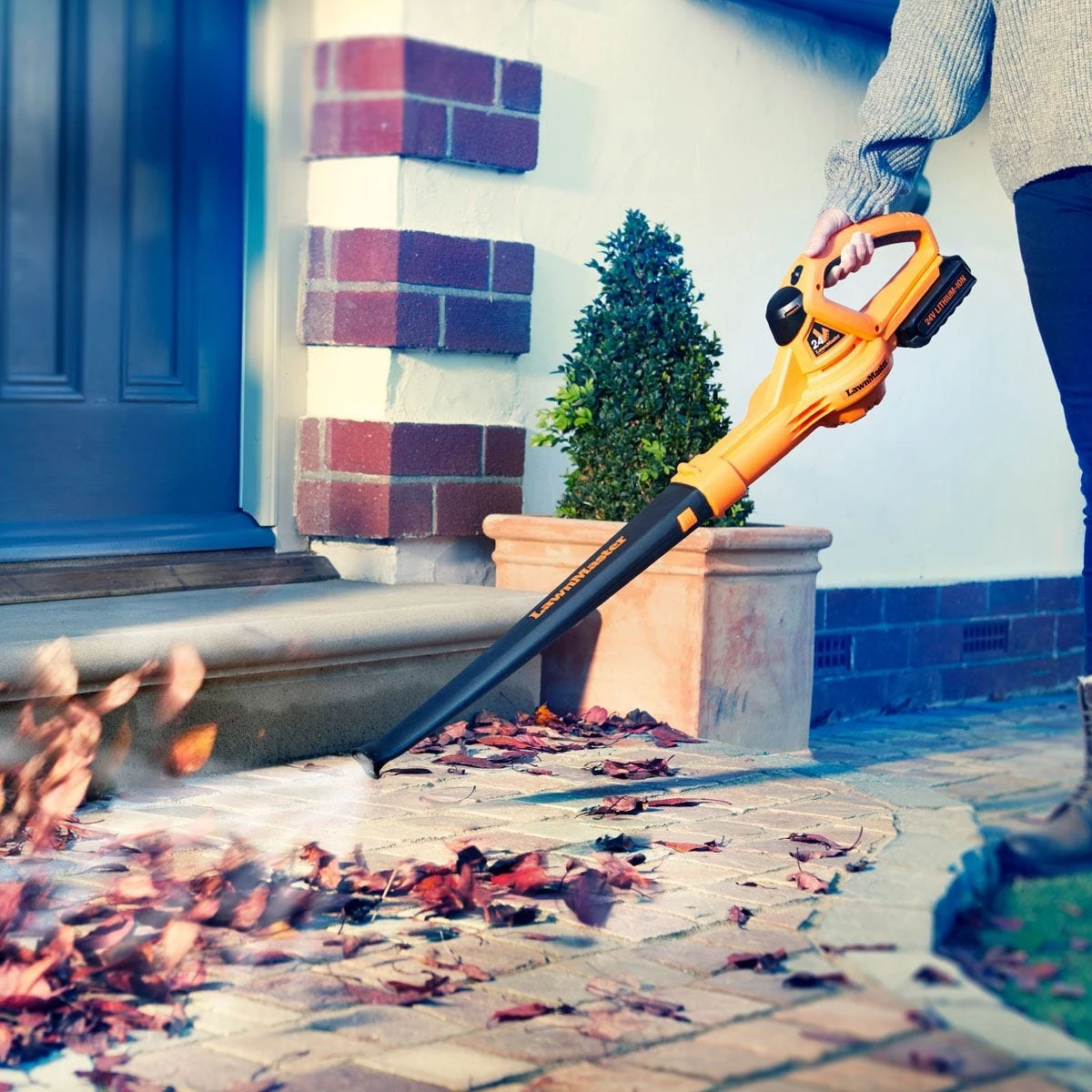 The LawnMaster 24V garden blower comes supplied with one 24V 2.0Ah lithium-ion battery and charger for up to 15 minutes of continuous run time. Battery charge indicator lights show how much charge is remaining in the battery at any given time.