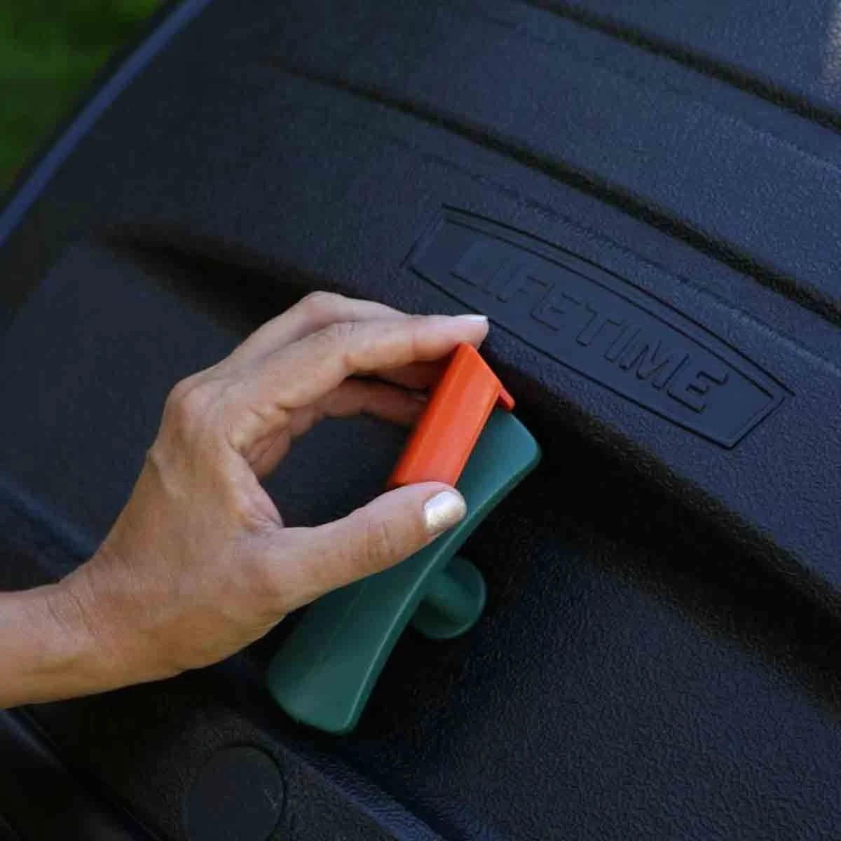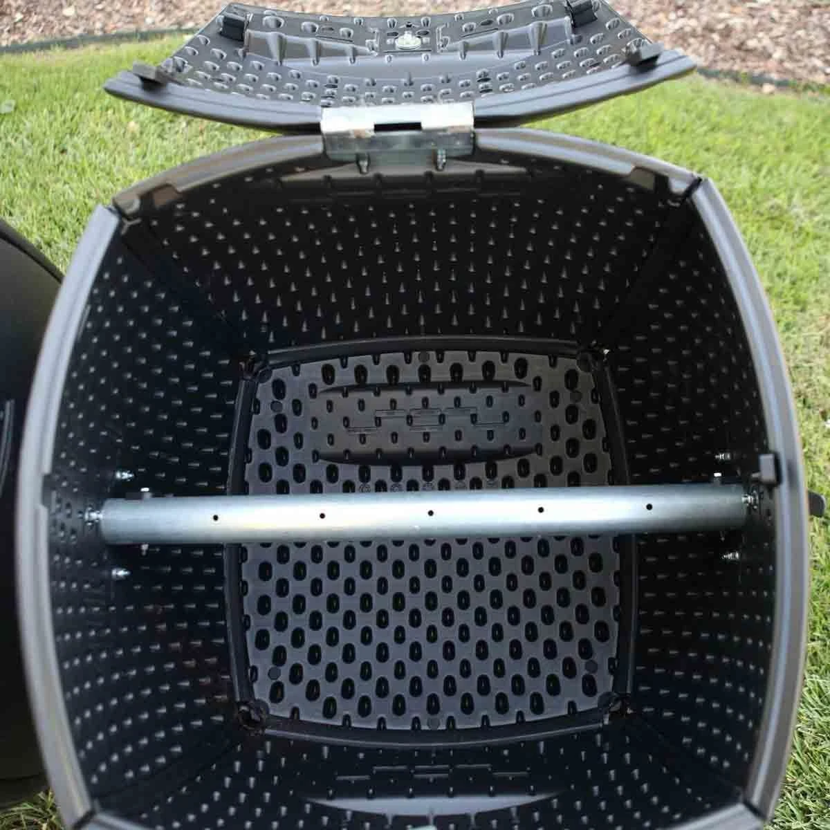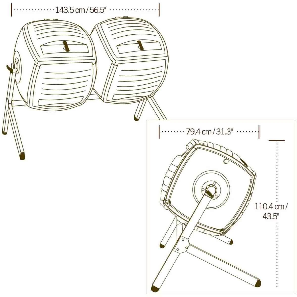 Featuring two 50-gallon (6.7 cubic ft.) tumblers, the Lifetime Dual Compost Tumbler is the perfect addition to your backyard. The ingenious tumbler design is perfect for easy batch composting. Both tumblers turn for balanced rotation, and the internal aeration bar mixes compost and provides air flow. Constructed of high-density polyethylene (HDPE), the Dual Compost Tumbler is durable, UV-protected, and has dark, double-wall panels to absorb and retain heat. For added convenience, it has an extra large removable lid and a spring-loaded pin that locks rotation during filling.