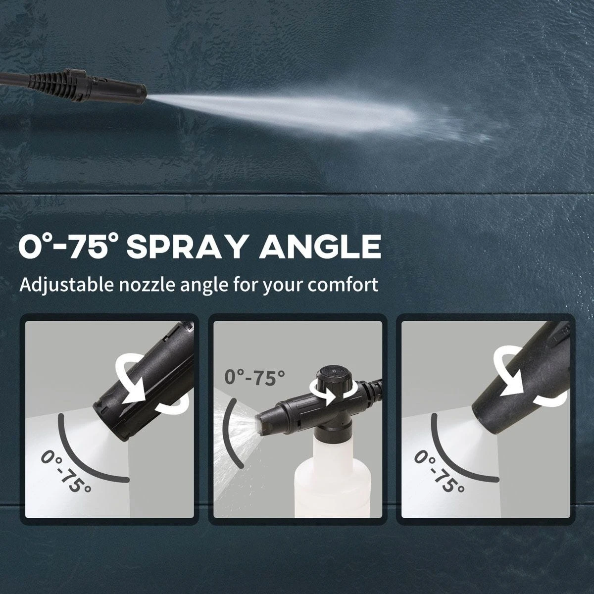 - Adjustable nozzle angle: Adjust the spray angle as needed from 0° to 75° to keep your hand in a comfortable position