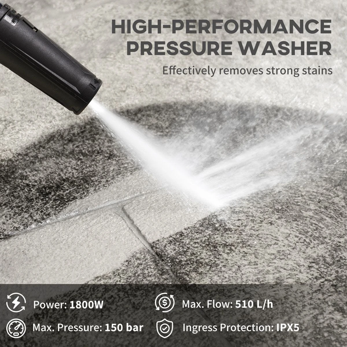 - Multiple cleaning tasks: The jet washer can support a rated pressure of 100 bar and a max. pressure of 150 bar thanks to the 1800W powerful motor, and can effectively deal with various of dirt from dust to stubborn stains. Vehicles, outer walls, deck floors, outdoor furniture, garden fences, and more – all of them can acquire a completely new outlook