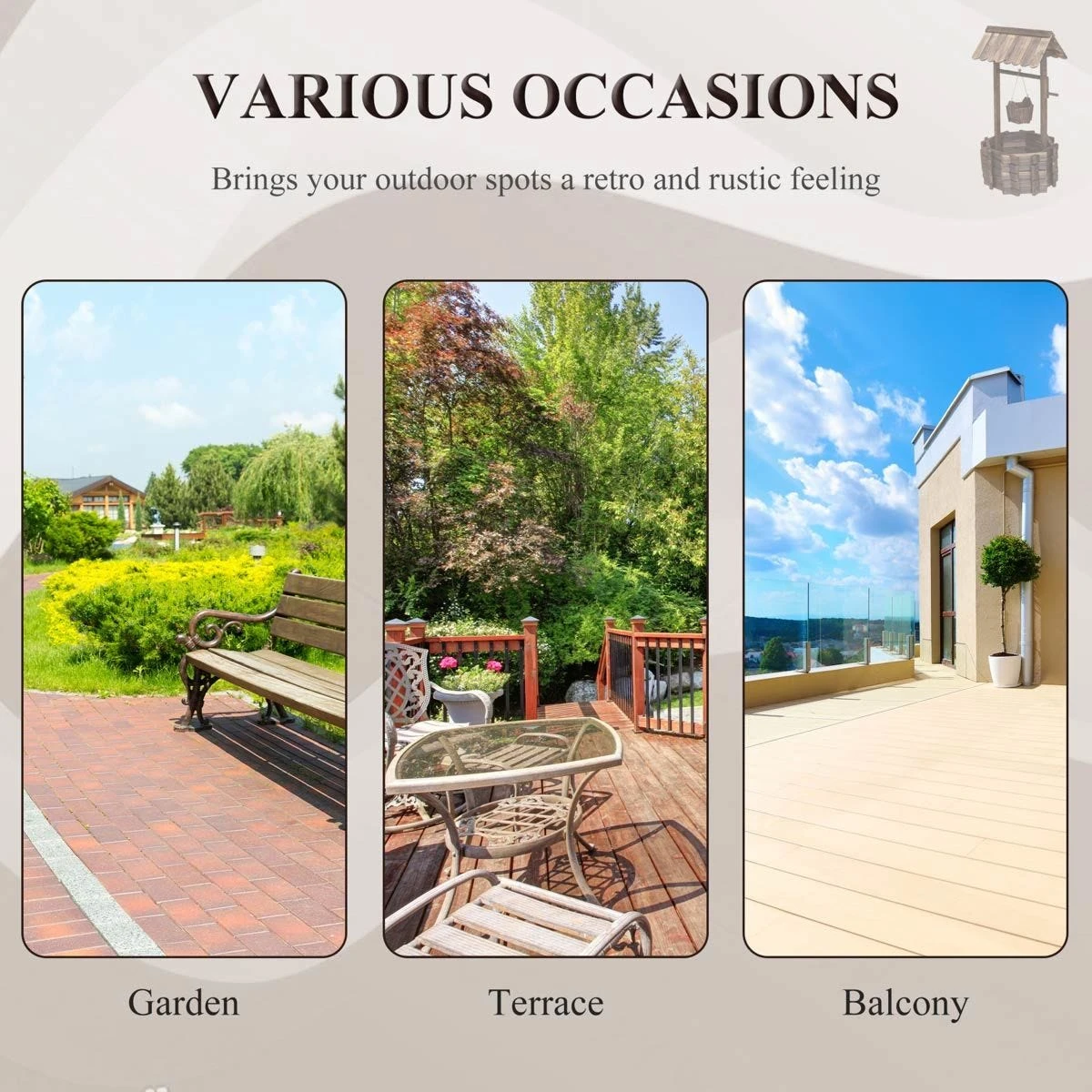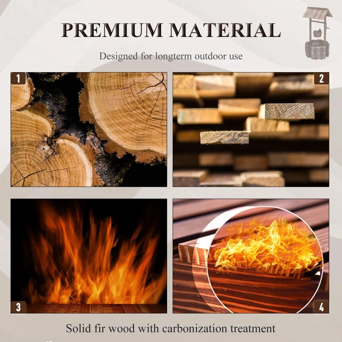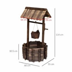 Outsunny water well planter will add an elegant and stylish look to your lawn or garden. Features burnt-like wood finish for a rustic appearance and fir wood construction keep the planter durable and long-lasting. Place various plants in the wishing well with large area and open base. The mini bucket is designed to place smaller plants and flowers at once. The garden planter features a top hut and a spacious well, which adds a fairytale accent to your garden or front yard.