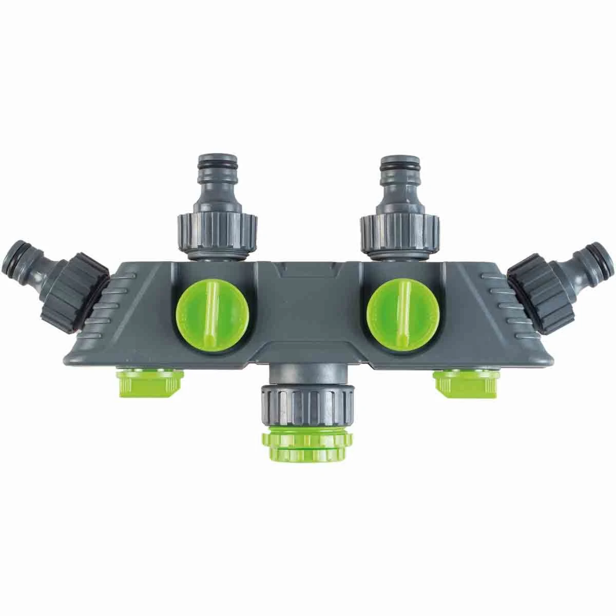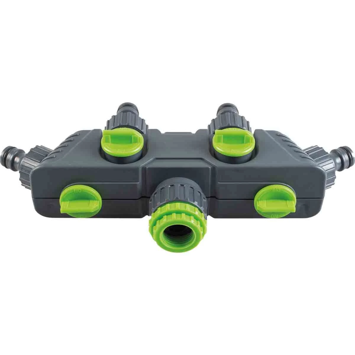 Garden hose4 way tap adaptor. Allows4 devices to be simultaneously connected to one tap. The water flow to each device can be independently regulated or switched off.