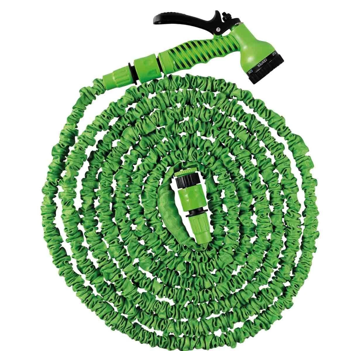 A hosepipe kit consisting of a length of3x expandable hosepipe, a threaded indoor/outdoor tap connector, a hose end connector and a 7 functionspray gun. The spray gun has 7 settings, Mist, Jet, Shower, Flat, Centre, Cone and Full. Ideal for watering your garden, washing your car and bathing pets etc. Expandable hosepipe will extend up to 3 times its original length with water pressure and returns to normal size when the water is turned off. Expandable hose has the advantage of being tangle, kink and twistfree andlighter and more manageable than a standard hose The kit is available with various lengths of hose, choose the hose length that suits the size of your garden.