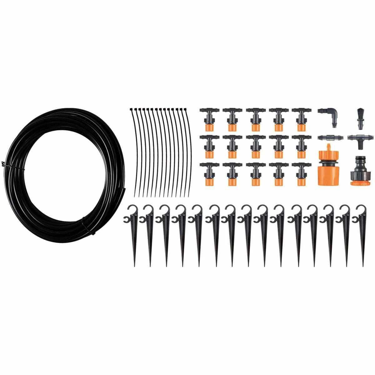 Micro-irrigation is the slow delivery of continuous fine mists of water onto the soils surface.This system of watering is highly effective in saving water and increasing water use efficiency as compared to conventional watering methods such as sprinklers, watering cans or hose pipes making it very eco friendly. Water is directed exactly where it is needed, the plant roots. Water run off, evaporation and wind driftis minimised. Everything you need such as tap connectors, ground spikes and drip emitters are supplied in this kit along with a generous 10 metre length of tubing. Ideal for cooling or plant irrigation. Simple to set up and use.