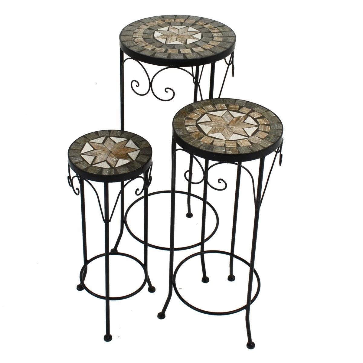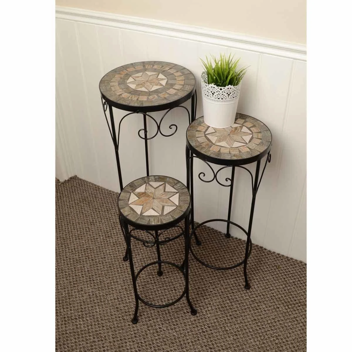 BRAVA Plant Stands – This hand crafted set of 3 tall round plantstands has a central star motif in its mosaic tops, made from a selection of light stone and slate coloured ceramic tiles with a fairly smooth finish. The steel edge, decorative scrolling and table legs have a slightly black glossed finish. Designed for use outside or in this set of 3 are at different heights and are sturdy enough to display a plant but can also be used as small side tables. The plant stand tops are manufactured from hand laid ceramic tiles with grout in between. The steel table edge and legs have a durable powder coated finish and the product comes pre assembled.