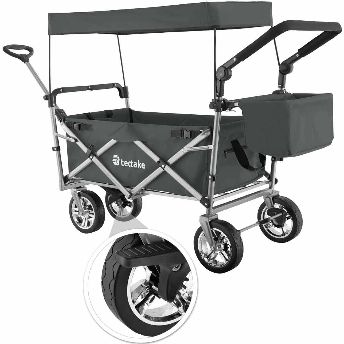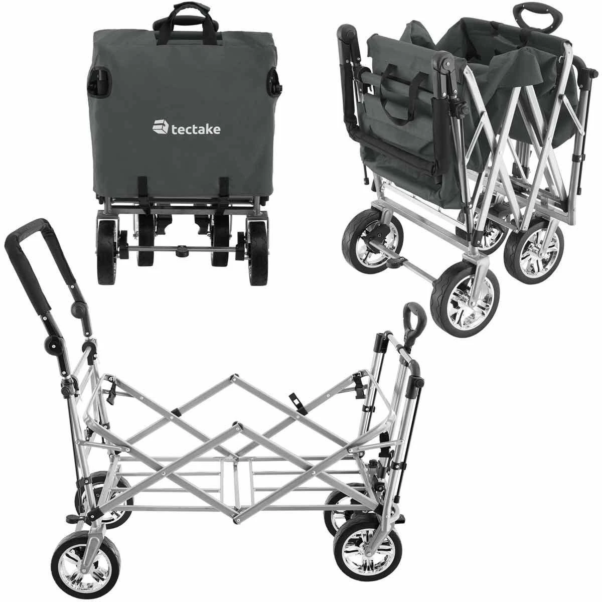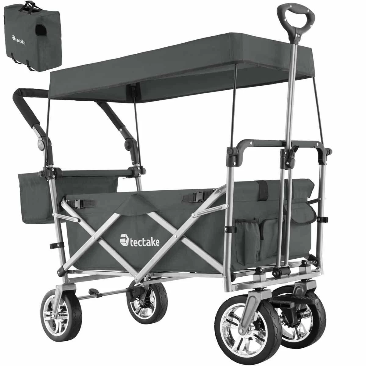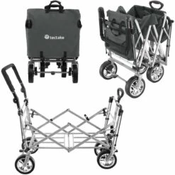 Lots of storage options and a removable roof are just some of the many highlights offered by this functional handcart Trolley from Tektake. The clever folding Mechanism means this transport cart is always ready to go. The removable tongue, adjustable handle and smooth plastic wheels with grip make pulling and manoeuvring a breeze. The sturdy steel frame and durable polyester fabric guarantee good durability, resistance to water and dirt as well as a long life – for use around the home, garden, on adventurous family trips or at exciting festivals.