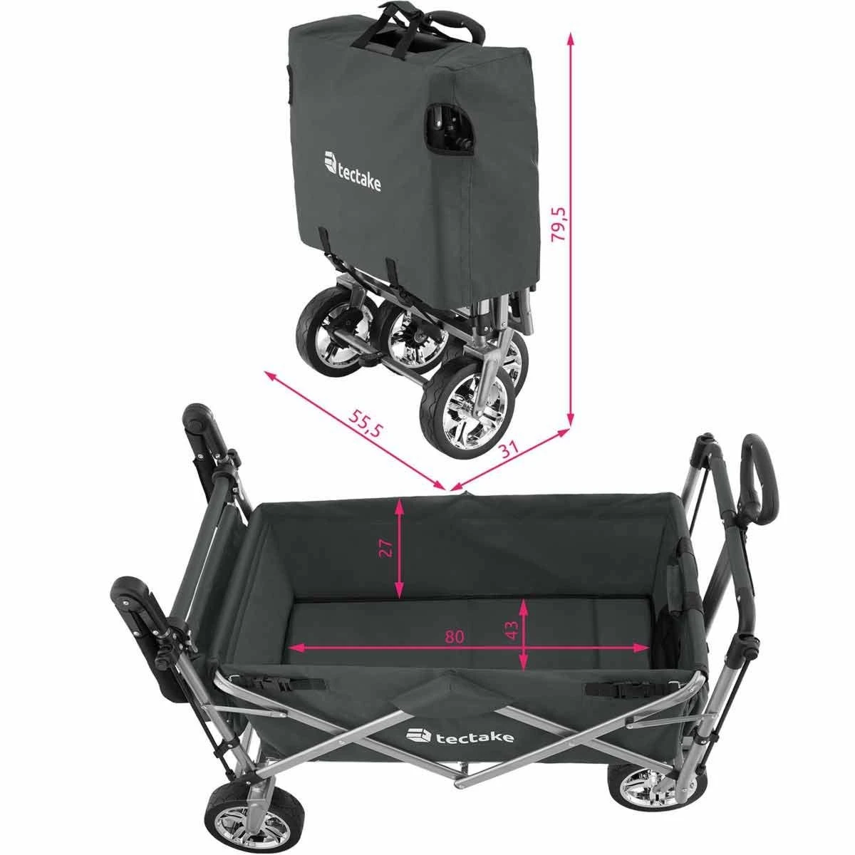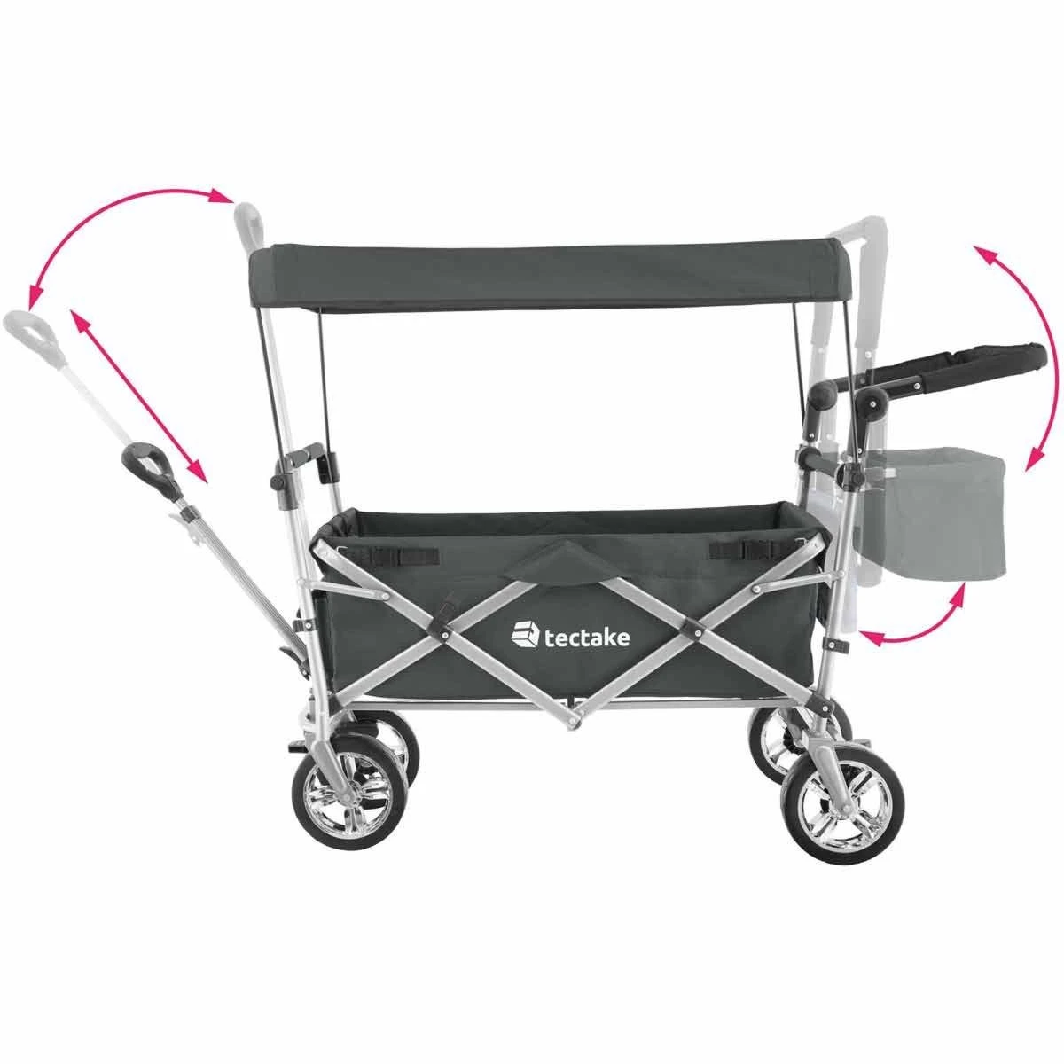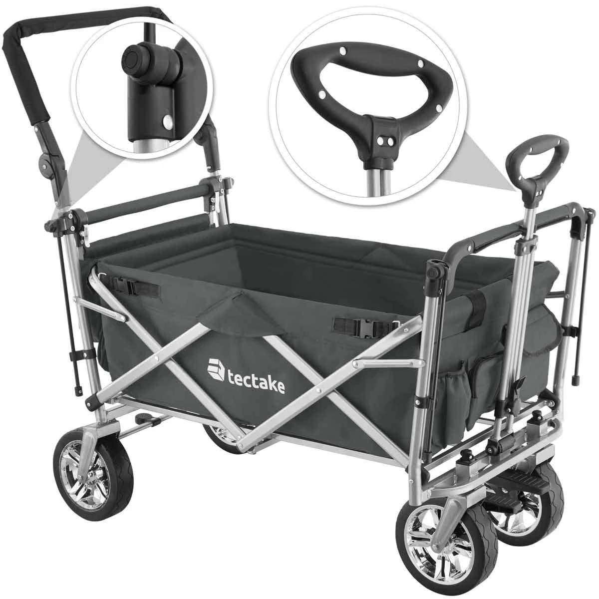 Lots of storage options and a removable roof are just some of the many highlights offered by this functional handcart Trolley from Tektake. The clever folding Mechanism means this transport cart is always ready to go. The removable tongue, adjustable handle and smooth plastic wheels with grip make pulling and manoeuvring a breeze. The sturdy steel frame and durable polyester fabric guarantee good durability, resistance to water and dirt as well as a long life – for use around the home, garden, on adventurous family trips or at exciting festivals.