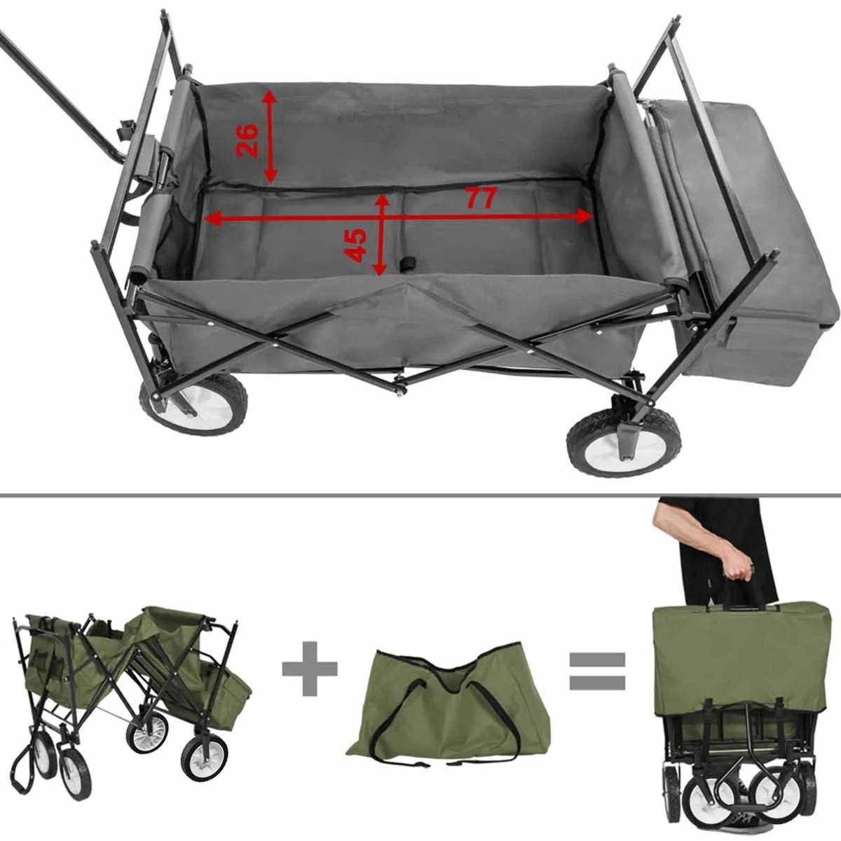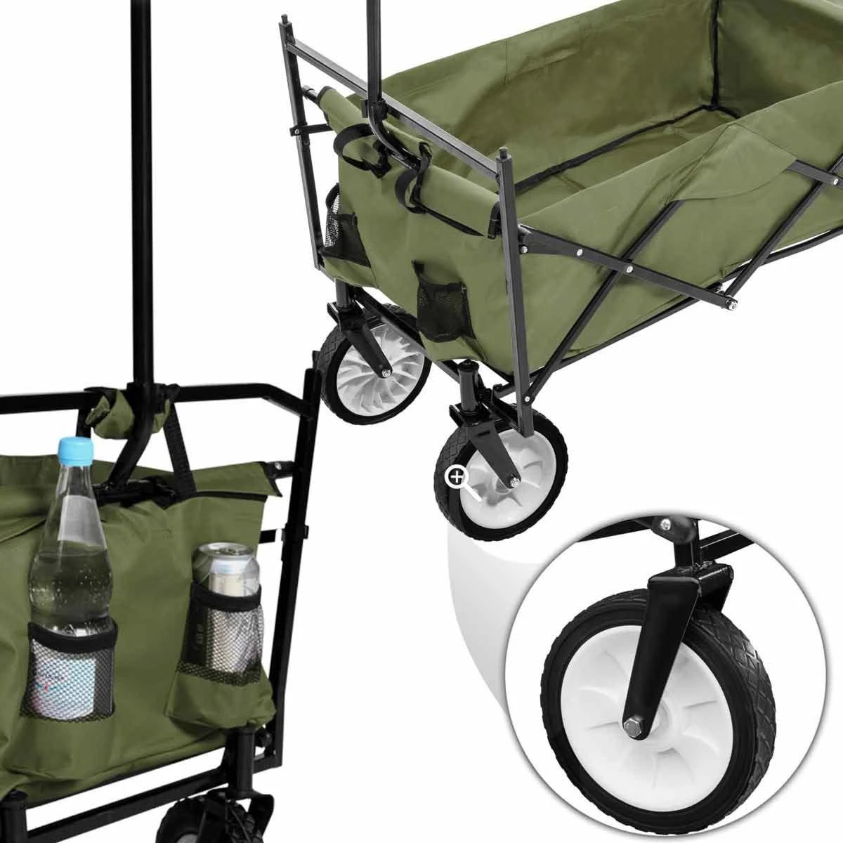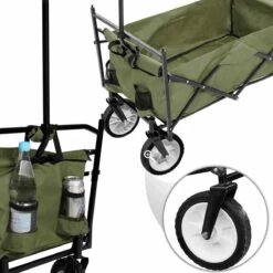 This folding pull along hand cart from Tektake is the perfect companion for gardening, hobby and recreational activities. The hand cart can be collapsed in just a few steps and is ideal to transport in the included bag. The Trolley is equipped with a rear bag, cup holder and a large loading area – so you can pack all sorts of things! The Trolley comes with a roof to protect the transported items and gardening tools from the sun. Whether in the home garden, on a hiking trip or when camping, this folding pull along Trolley is ideal for your outdoor activities.