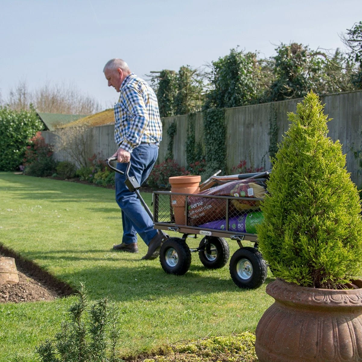 Move logs, plants, tools, fertiliser-sacks, logs, garden-waste and a whole lot more around your property the easy way with this practical and convenient garden-trolley from Handy!