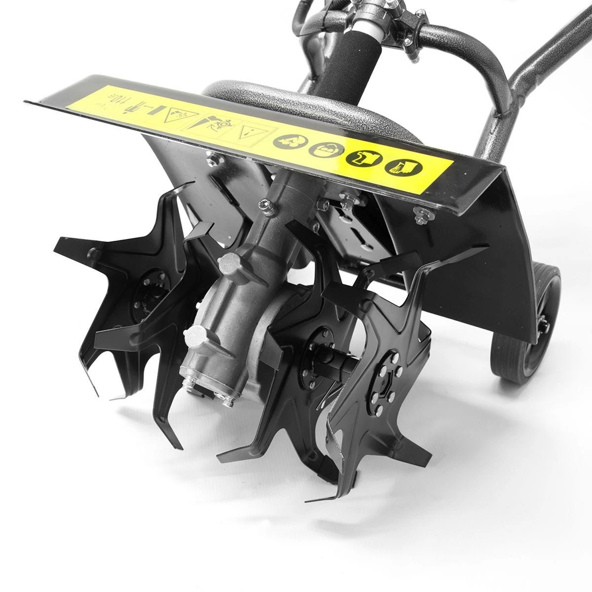- Powerful – Premium 1.9hp (43cc) two-stroke engine drives the four six-bladed steel rotors making light work of even the craggiest of soil.Â