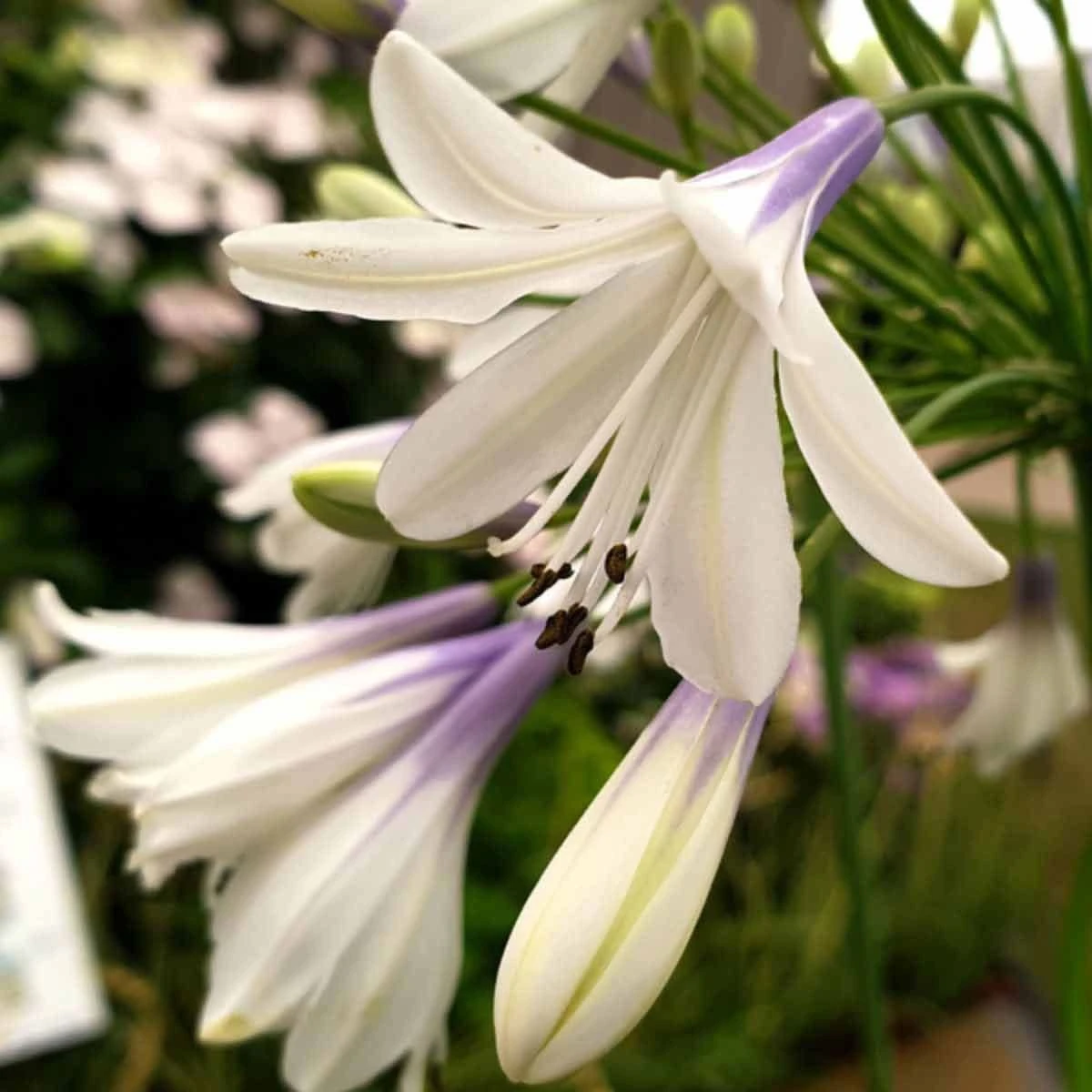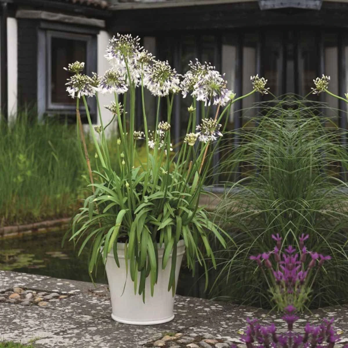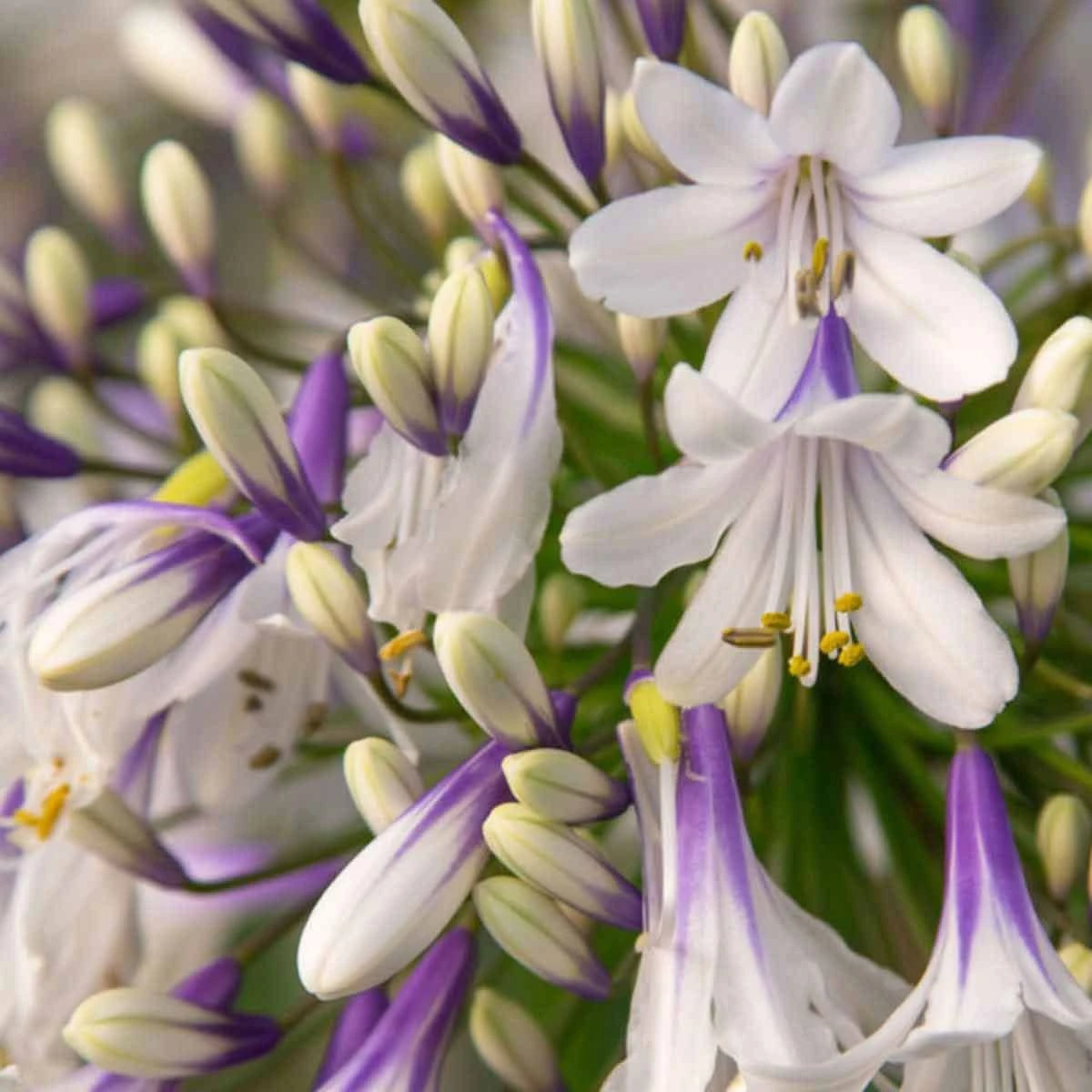 Upright white buds open to show off pretty hanging flowers with stunning blue bases and flaring white petal tips which keep blooming long after other agapanthus are finished – often well into September – giving a full 3 months of striking colour.
