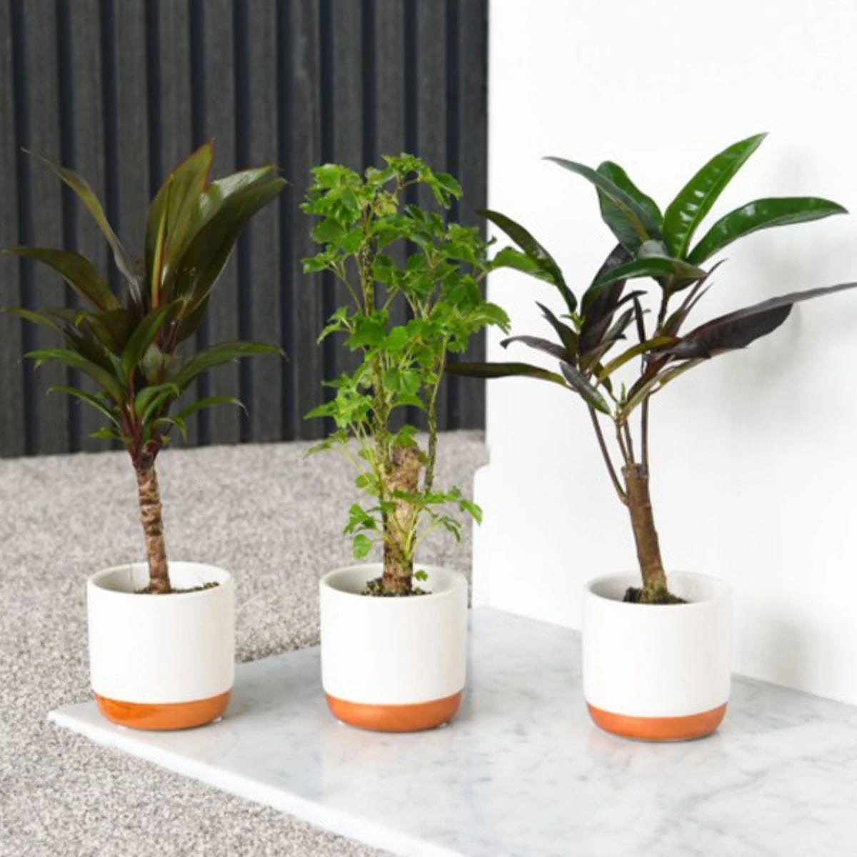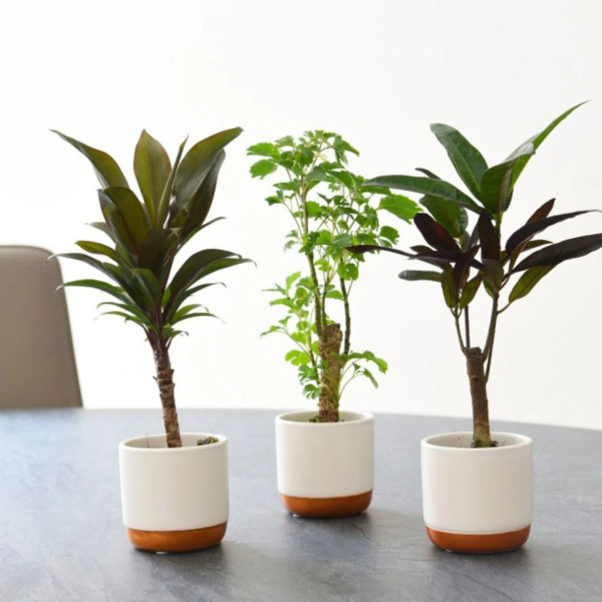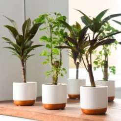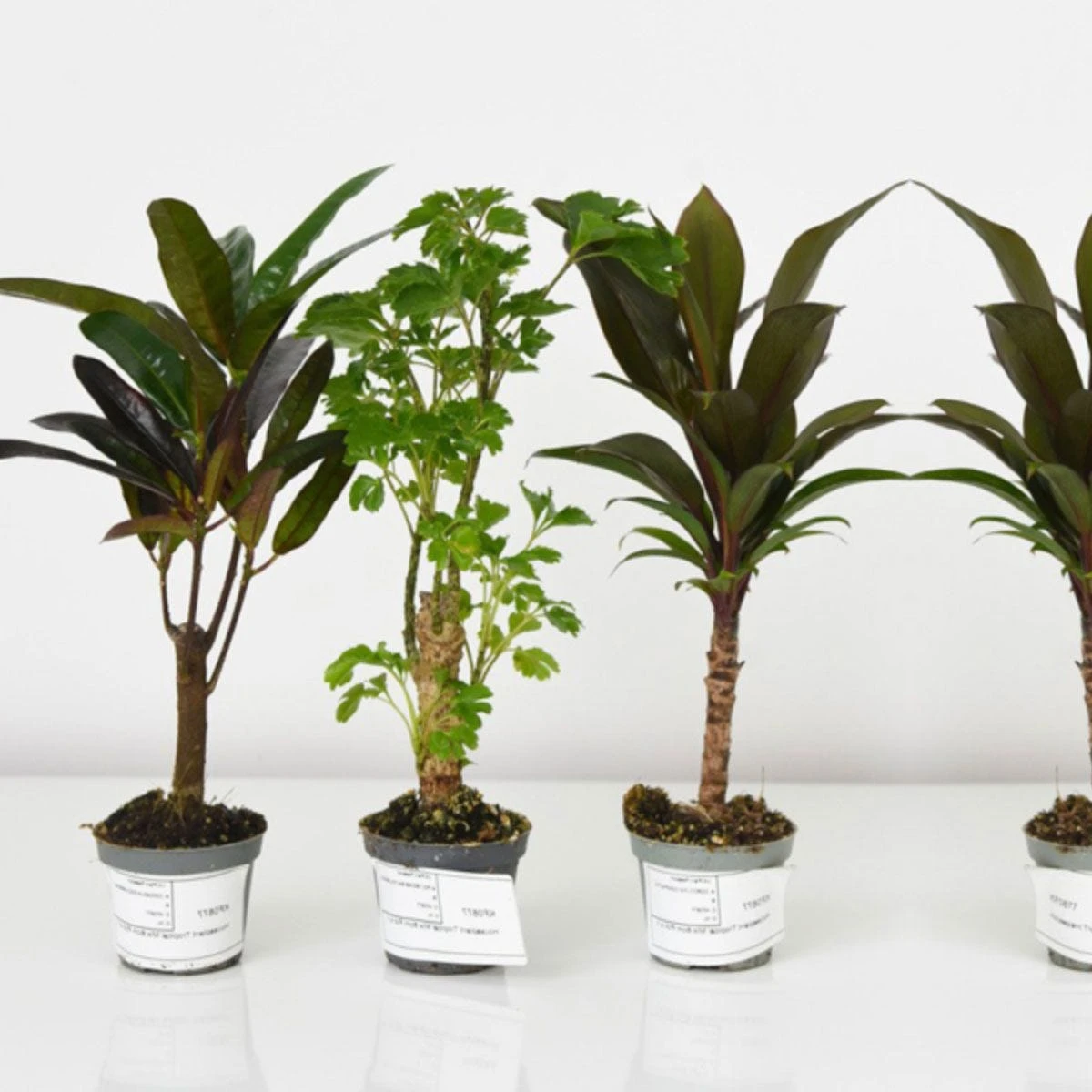 Why not start your own jungle forest with this mix of tree-like tropical exotic houseplants? These easy-care houseplants make an instantaneous element that will give a lift to any room. Showcasing bare stems topped with a canopy of lush foliage in variegated red, green and yellow hues.
