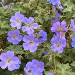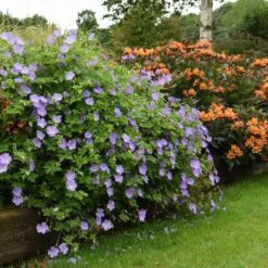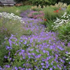 Geranium ‘Rozanne’ is a hardy perennial and a celebrated Cranesbill variety that produces masses of saucer-shaped, violet-blue blooms with dainty white centres. It is a sterile hybrid, ensuring it flowers repeatedly throughout the summer without self-seeding. This hardy perennial is perfect for ground cover in the front of informal borders or spilling from containers. As summer comes to an end, the foliage transforms into loose mounds of reddish brown and fiery orange, providing an extended display into autumn.