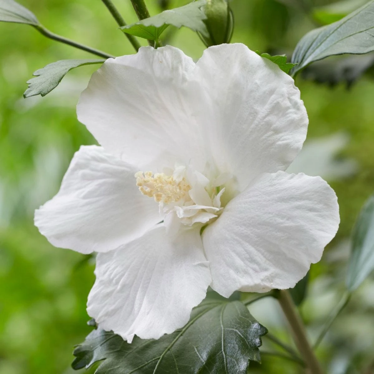 Hibiscus ‘Flower Tower White’ is a hardy shrub with a narrow columnar habit, making it ideal for small gardens and tight spaces. It reaches a height of up to 300cm but with a spread of just 75cm. This pretty plant features dense branching towers packed with pure white, semi-double flowers from late summer to autumn, which attract beneficial pollinators. It is drought-tolerant once established and can be used to frame architectural features in gardens.