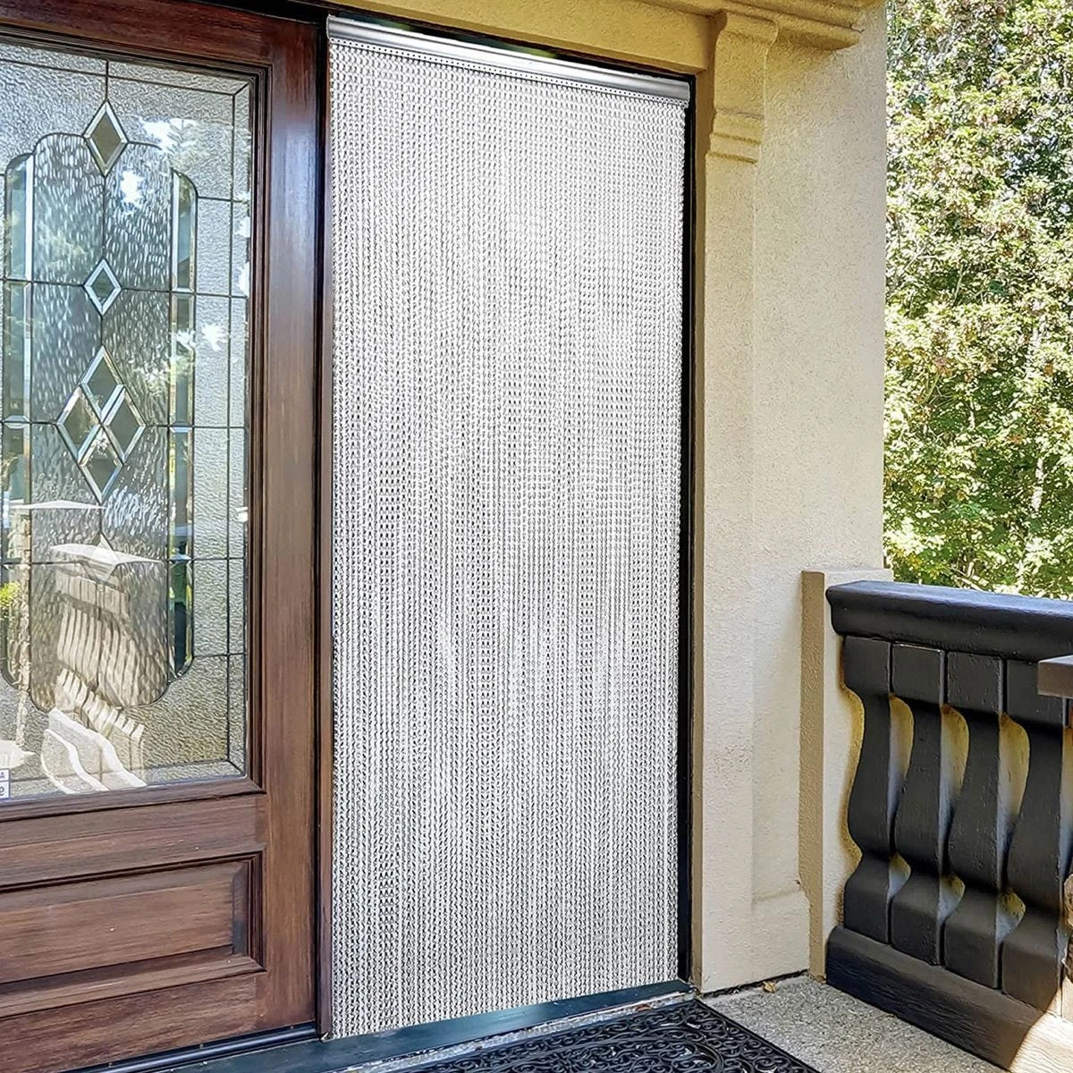 - Measurements This fly screen has a hanging rail of 90cm, a chain-link drop of 210cm and a link size of 12mm x 24mm. It has 69 chain links + 2 FREE spare! It also has a breaking strain of 23kg