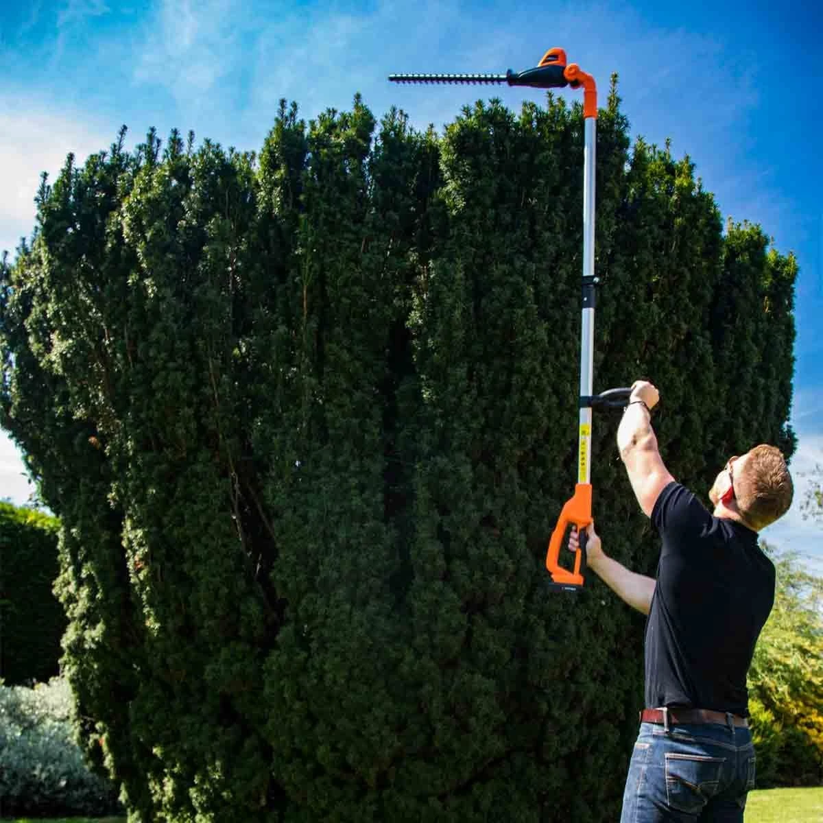 The Yard Force 20V Cordless Pole Hedge Trimmer is designed to provide the user with comfort and ease when doing garden tasks. Made with a lithium battery your trimming will be done without any wires making it perfect for reaching far hedges, keeping your garden looking clean and tidy. With an extendable design, the Hedge trimmer can help you reach your hedge with ease and without a ladder. Designed with a 45 cm blade the Hedge trimmer is suitable for medium size hedges and made with a dual-action steel blade.Â